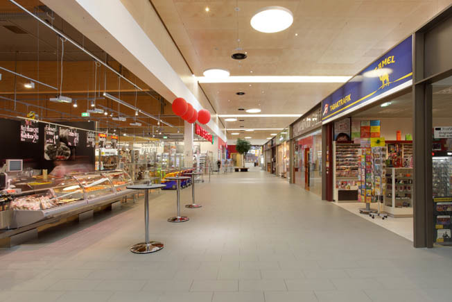 Damit während der gesamten Bauzeit das Einkaufen ermöglicht werden könnte wurden Abriss und Neubau in mehreren Phasen ausgeführt. Im Vergleich der unterschiedlichen Entwurfs- und Kostenstudien hat sich herausgestellt, dass die Errichtung in Holz nicht nur am kostengünstigsten, sondern auch vom Bauablauf her (schnelle Montage, keine Austrocknungszeiten,...) ideal ist.