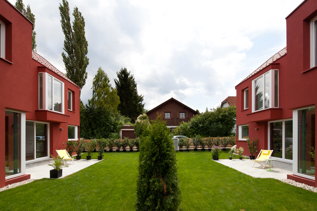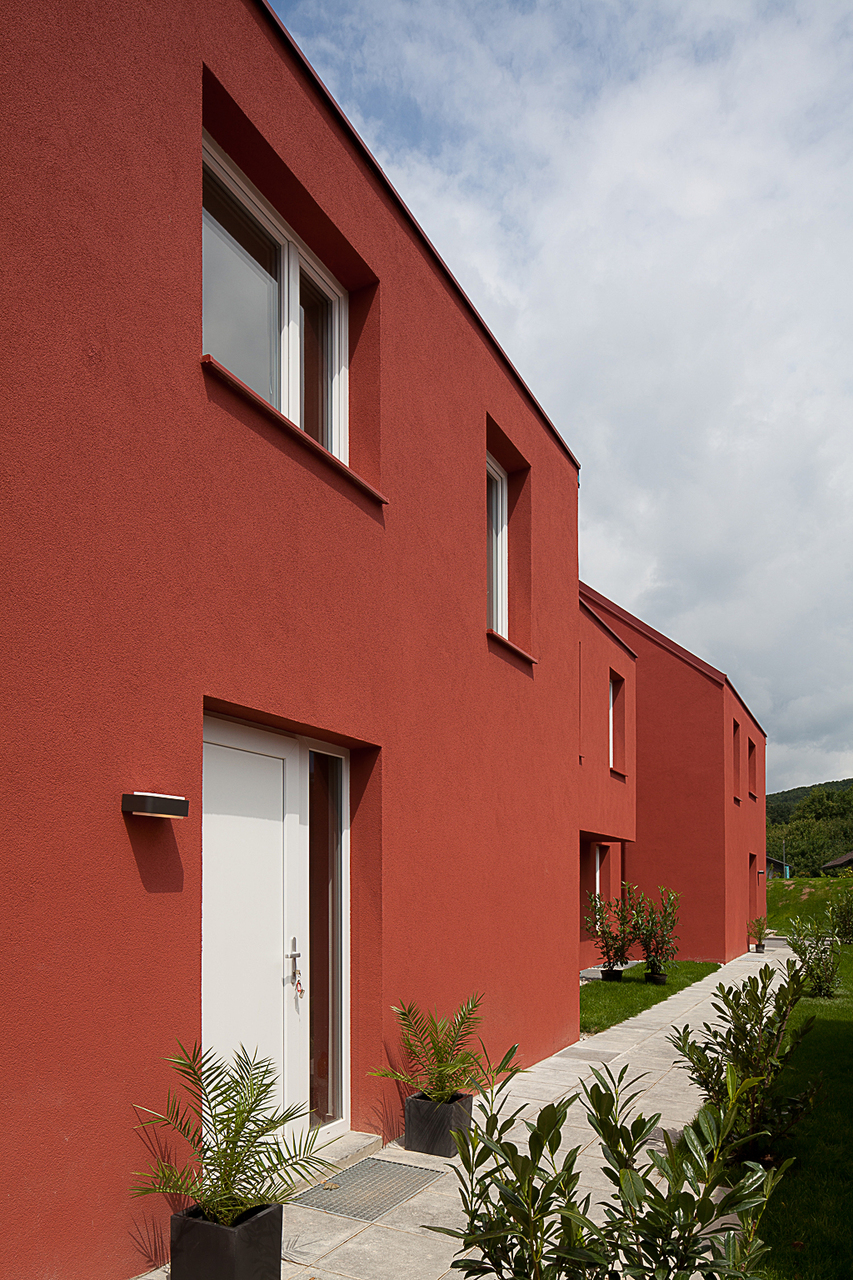 Die Häuser sind einfache Volumen mit Satteldächern von 45° Neigung. In der Länge verspringt der Baukörper quer zu seiner Längsachse um 2 Meter, und lockert so die starre Riegelform auf. Die Baukörper sind prägnant und einheitlich geformt. Für das äußere Erscheinungsbild wurde ein kräftiges Dunkelrot gewählt.