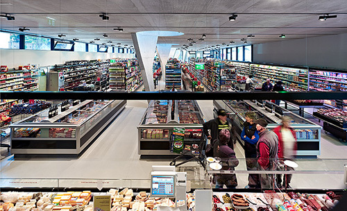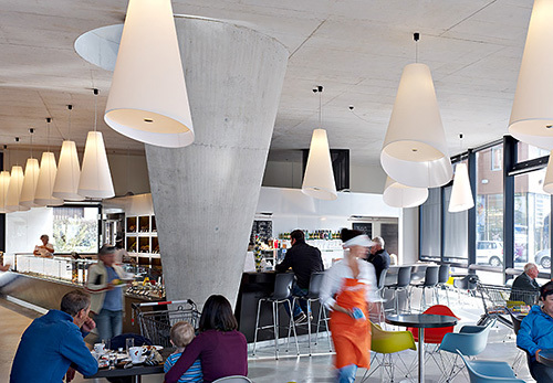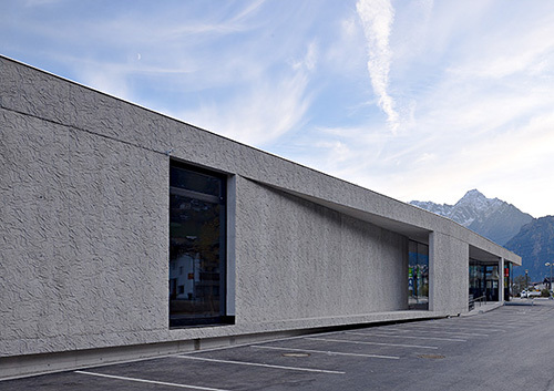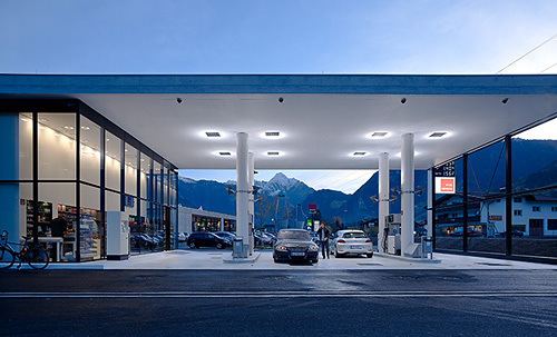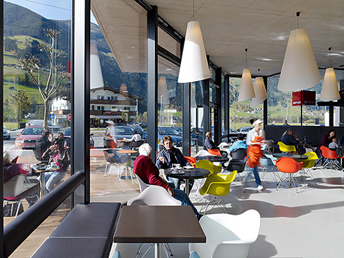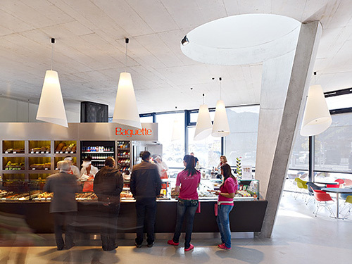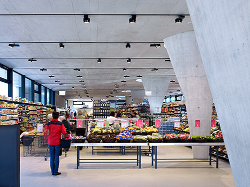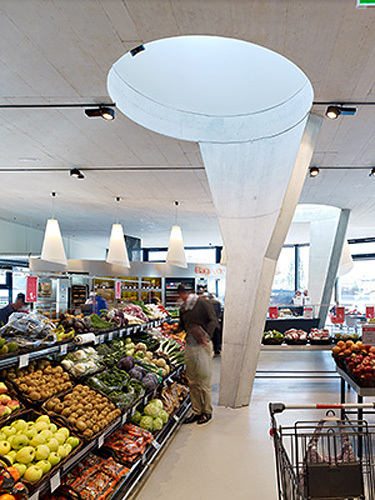 Auf das direkt an der Zillertalstraße gelegene Grundstück setzt Wiesflecker einen bewusst puristischen Baukörper, der als rohe Betonschatulle den Marktraum umfasst. Diese oberflächenroh geschalte Hülle soll altern und Spuren ansammlen und – so Wiesflecker – hoffentlich bald zum „südamerikanischen“ Beton werden. Fünf Dachöffnungen bringen über konische Betonstützen Nordlicht in den Innenraum, die dynamisch gestellten Stützelemente strukturieren zugleich den monochromen Innenraum und verleihen ihm eine spezielle Atmosphäre. Die konische Form der Stützelemente variierend prägen große Lampen den Baguette-Café-Bereich, der sich über raumhohe Verglasungen nach Süd-Westen auf eine Terrasse öffnet. Im nördlichen Bereich des Gebäudes wurde außerdem Raum für eine BIPA-Drogerie geschaffen, dem Markt vorgelagert befindet sich eine Gutmann-Tankstelle mit kleinem MPREIS-Shop. (Text: Claudia Wedekind)