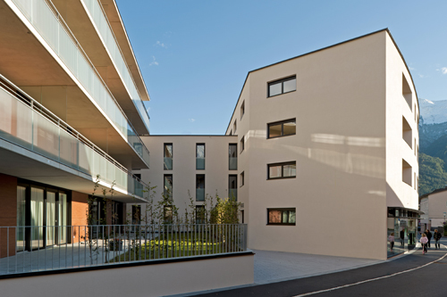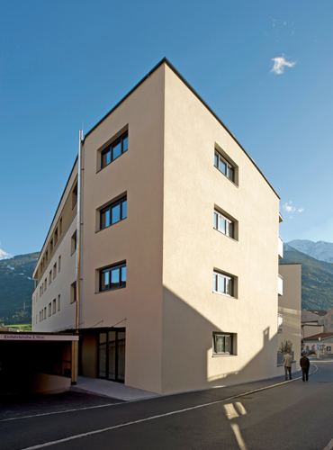 In den einzelnen Geschossen sind neben der Ordination eines Kinderarztes insgesamt 38 Wohnungen untergebracht, die zum Teil behindertengerecht ausgestattet wurden und damit in der Wohnform „Betreutes Wohnen“ nutzbar sind. Sämtliche Wohnungen verfügen über private Freiflächen, den drei im Erdgeschoss liegenden Wohnungen sind Privatgärten zugeordnet, allen anderen süd- bzw. westseitige Balkone, Loggien oder Terrassen. Die notwendigen Autoabstellplätze wurden in zwei getrennten, über Rampen erschlossenen Tiefgaragenteilen untergebracht. (Text: Architekten; redakt. bearbeitet von Claudia Wedekind)