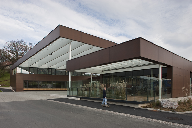 Das Gebäude wird aus zwei ineinander verschränkten Winkeln geformt. Der ebenerdige Bauteil beinhaltet die Bereiche Bürgerservice, Bibliothek und Gastronomie. Der zweigeschoßige Gebäudeteil nimmt das Gemeindeamt mit Trauungs- und Sitzungssaal und die Büroräume im Obergeschoß auf. Das große, in den Baukörper integrierte, transluzente Vordach bildet den überdachten Vorbereich des Gemeindezentrums.