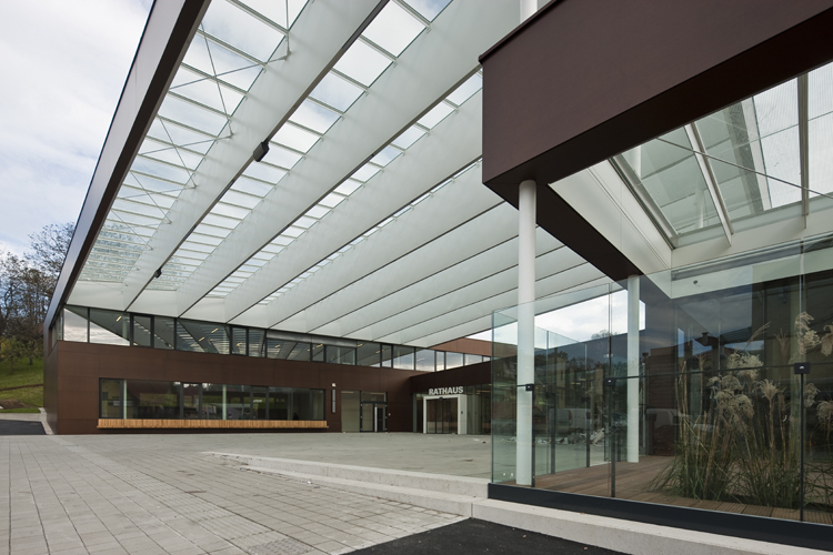 genutzt werden können, miteinander verbindet. Im Obergeschoß befindet sich ein weiterer offener Wartebereich, um den sich die einzelnen, intern miteinander verbundenen Räume der Gemeindeverwaltung reihen. Die helle und fließende Wirkung wird geprägt von Glastrennwänden und einzelnen weißen Kuben, in denen diskrete Besprechungsräume untergebracht sind.