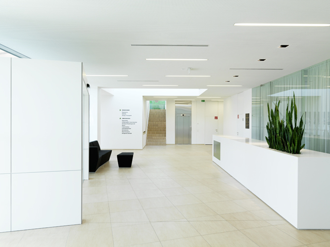 Mittel- und Angelpunkt des Hauses ist das großzügig dimensionierte Foyer, das sowohl Kommunikations- und Informationszentrum ist, als auch alle Funktionsbereiche, die bei Bedarf jeweils einzeln