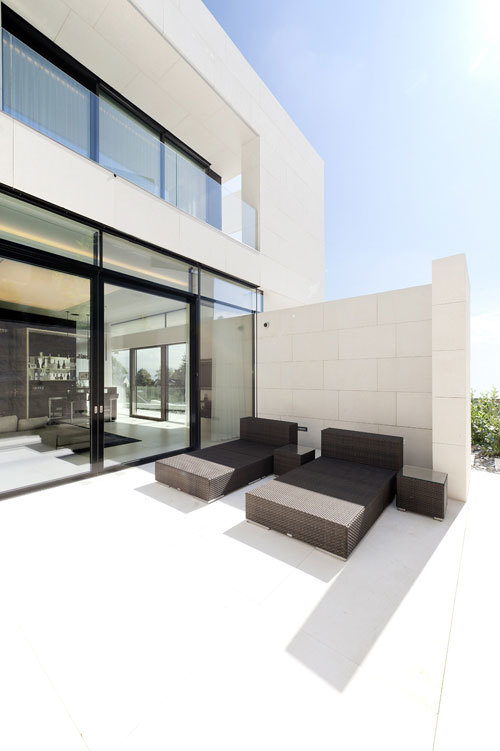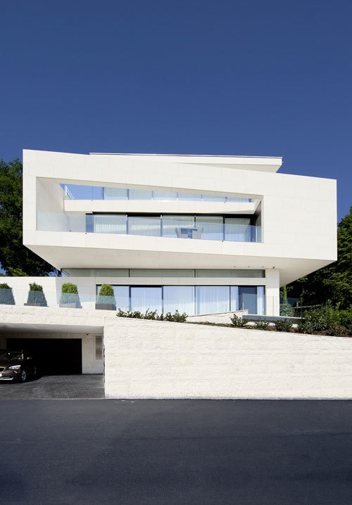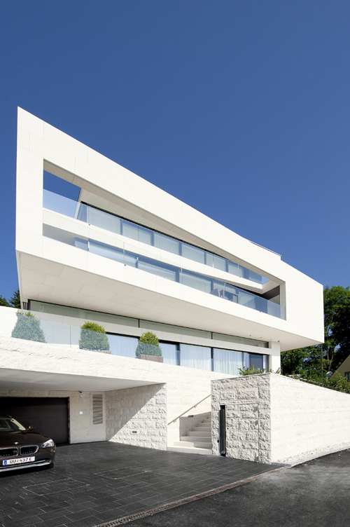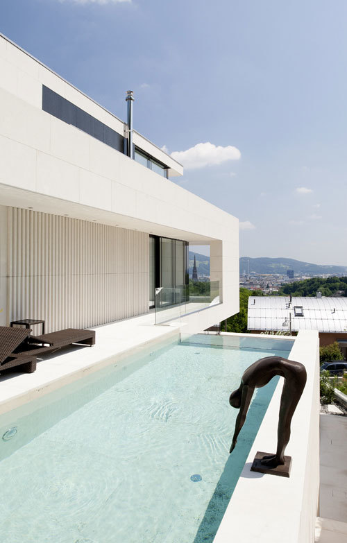 Auf besonderen Wunsch des Bauherrn wurde das ganze Haus mit hellem Kalkstein verkleidet. Für eine spannende Zonierung der Steinflächen wurden teilweise stark kannelierte Platten verarbeitet. Sind die Platten an den Gartenmauern noch bruchrauh verlegt, so wird das Plattenmaterial nach oben bzw. innen immer feiner. Die Innenräume fließen durch die Verwendung von großformatigen Steinplatten nach außen, setzen sich dort im Raster fort, durchlaufen den Pool und lassen dadurch das Haus sowohl innen als auch außen zu einer Einheit verschmelzen. Die gesamte Gestaltung kommt mit nur wenigen Materialien aus. Dunkles Eichenholz, Naturstein, Glas und Leder ziehen sich durch alle vier Geschoße und gestalten sämtliche Innenräume. Eine transparente Treppekonstruktion mit frei auskragenden Stufen in Stein bzw. Holz verbindet die Wohngeschoße. Der zum Innenraum verglaste Liftschacht ist hinterleuchtet und bildet das vertikale Rückgrat des Hauses. Der zentrale mehrgeschoßige Luftraum schafft spannende Sichtverbindungen. In jedem Geschoß öffnen die Glasfronten spektakuläre Aussichten auf die Stadt. (Text: Architekten)