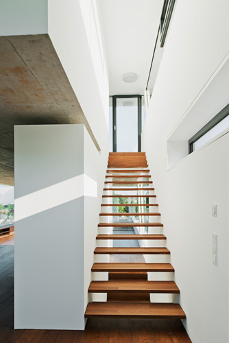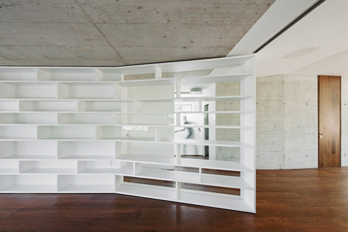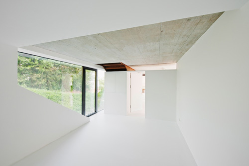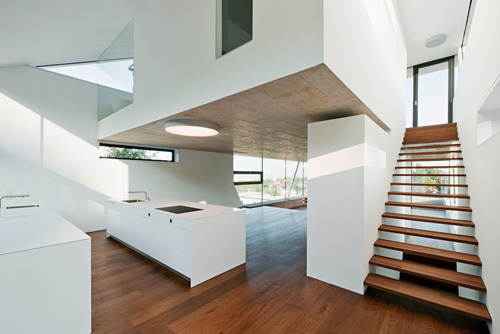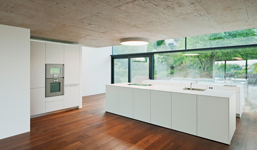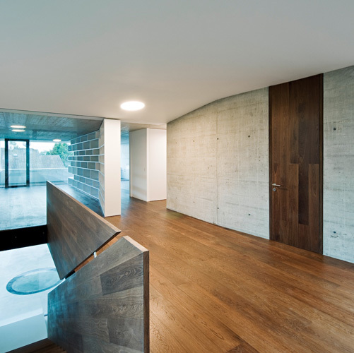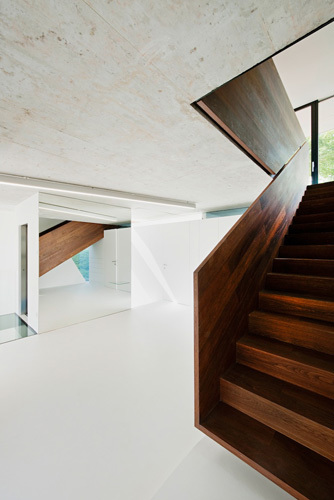 Ineinander übergehende Raumzonen schaffen ein fließendes Kontinuum, das durch eingebaute Schränke, die auf Sitzhöhe vom Wohnzimmerniveau in den Boden des um drei Stufen höhergelegenen Küchenbereichs übergehen, verstärkt wird. Nicht zuletzt aufgrund des gleichen Materials – der „Vulcano Eiche“ – von Fußboden und Einbaumöbelstück. Neben der dunklen Eiche beschreiben weiße Wände, größtenteils weiße Möbel, Küchen- und eine Badezimmerausstattung, graue Sichtbetondecken und dunkelgraue Fensterprofile die wenigen Materialien und Farben, die sich konsequent eingesetzt durch das gesamte Haus ziehen.