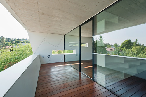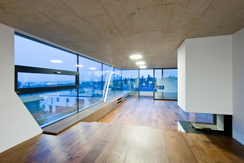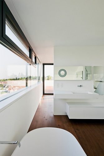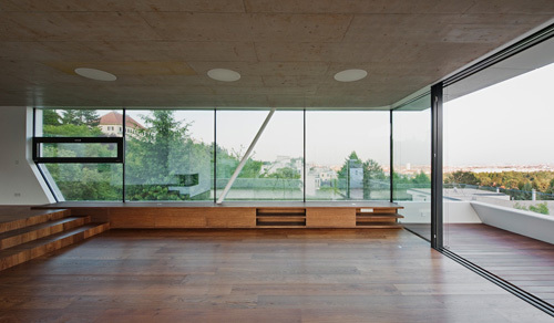 Blickachsen verbinden nicht nur den umliegenden Garten und die entfernte Stadtsilhouette mit den Wohnräumen, auch innerhalb des Hauses liefern Sichtbezüge zwischen den einzelnen Räumen und Geschossen interessante optische Eindrücke. So blickt man etwa vom verglasten Badezimmer und der Badewanne aus in den darunterliegenden Küchenbereich und darüber hinaus direkt in den Garten. Um 180° geschwenkt schweift der Blick ebenfalls von der Badewanne aus durch das Schlafzimmer über die riesige Terrasse bis zum Stephansdom.