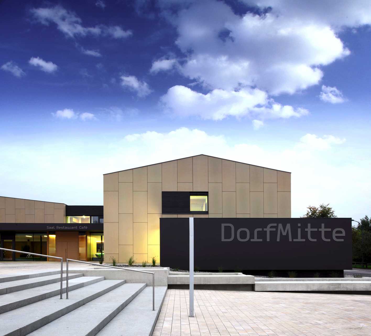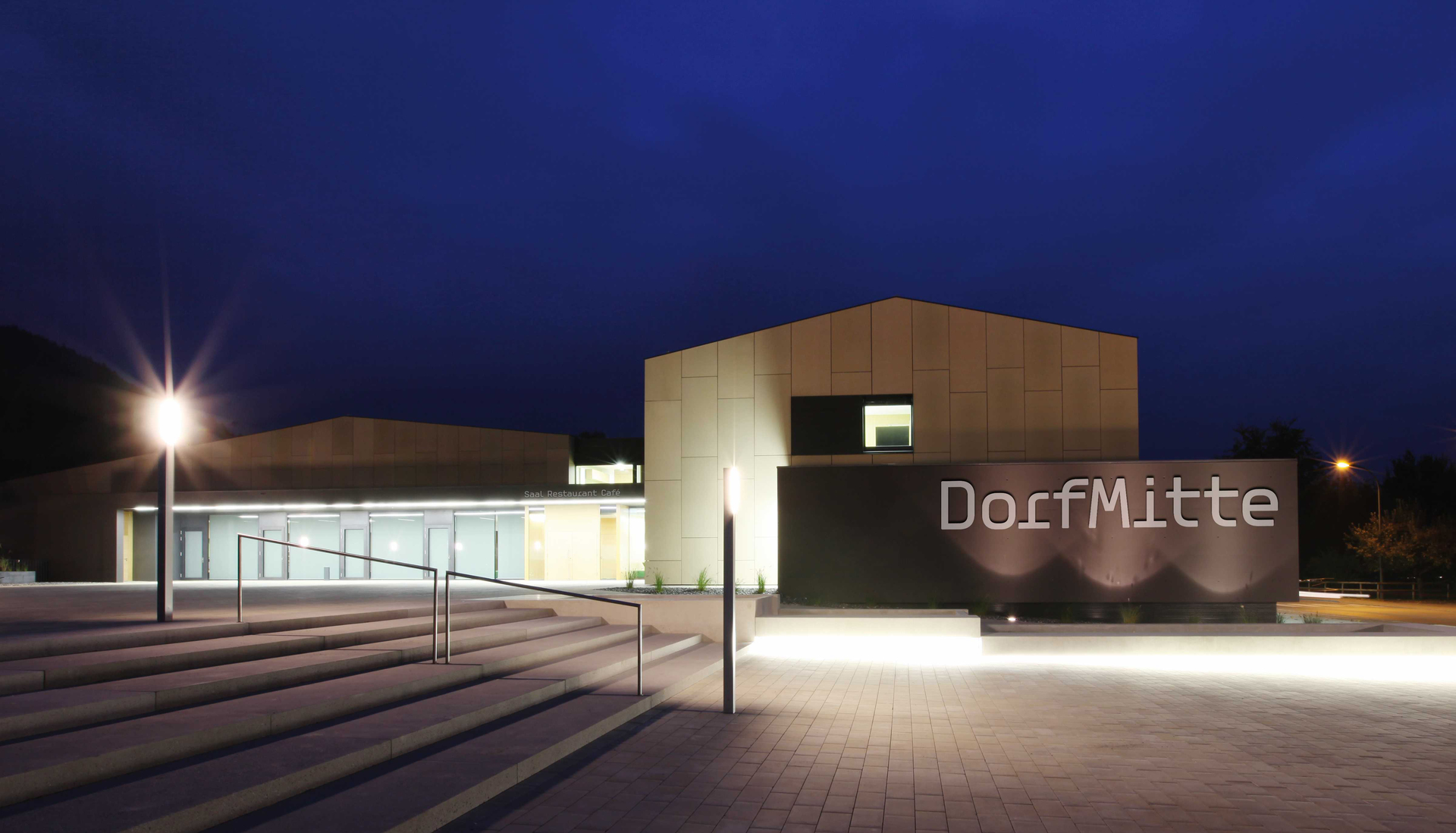 Koblach bekommt eine DorfMitte. Die Mauern sind die alten, auf denen das neue Gemeindezentrum basiert. Gemeindeamt, Gemeindesaal, Dorfplatz mit Dorfbrunnen und Tiefgarage tragen als attraktives Angebot für Begegnung und Kommunikation zur Stärkung und Belebung der Gemeinde bei.Breite Treppen und Rampen verbinden die zwei Ebenen des großzügigen, verkehrsfreien Dorfplatzes. Das vorhandene L-förmige Gebäude wird um drei Elemente erweitert: Straßenseitig definiert ein verglaster Zubau den neuen Eingang des Gemeindeamts; dem Dorfplatz zugewandt ist das erweiterte Saalfoyer; ostseitig wird die Küche vergrößert. Durch farbliche und Material-Differenzierung der Fassaden bleiben Altbau und Zubauten als einzelne Bauteile erkennbar. Unterschiedliche Lichtelemente im Außenbereich lassen die Baukörper auch in der Nacht attraktiv erscheinen. Über eine außenliegende, gedeckte Rampe gelangt man zum Gemeindeamt. Es wird im wahrsten Sinn des Wortes geöffnet: Stützen und Träger ersetzen bestehende Wände und geben dem Bürgerservice viel Raum. Der Sitzungssaal ist nun oben zu finden. Über das separate Stiegenhaus sind Arztpraxis, das Museum für Urgeschichte und der Jugendbereich erschlossen.