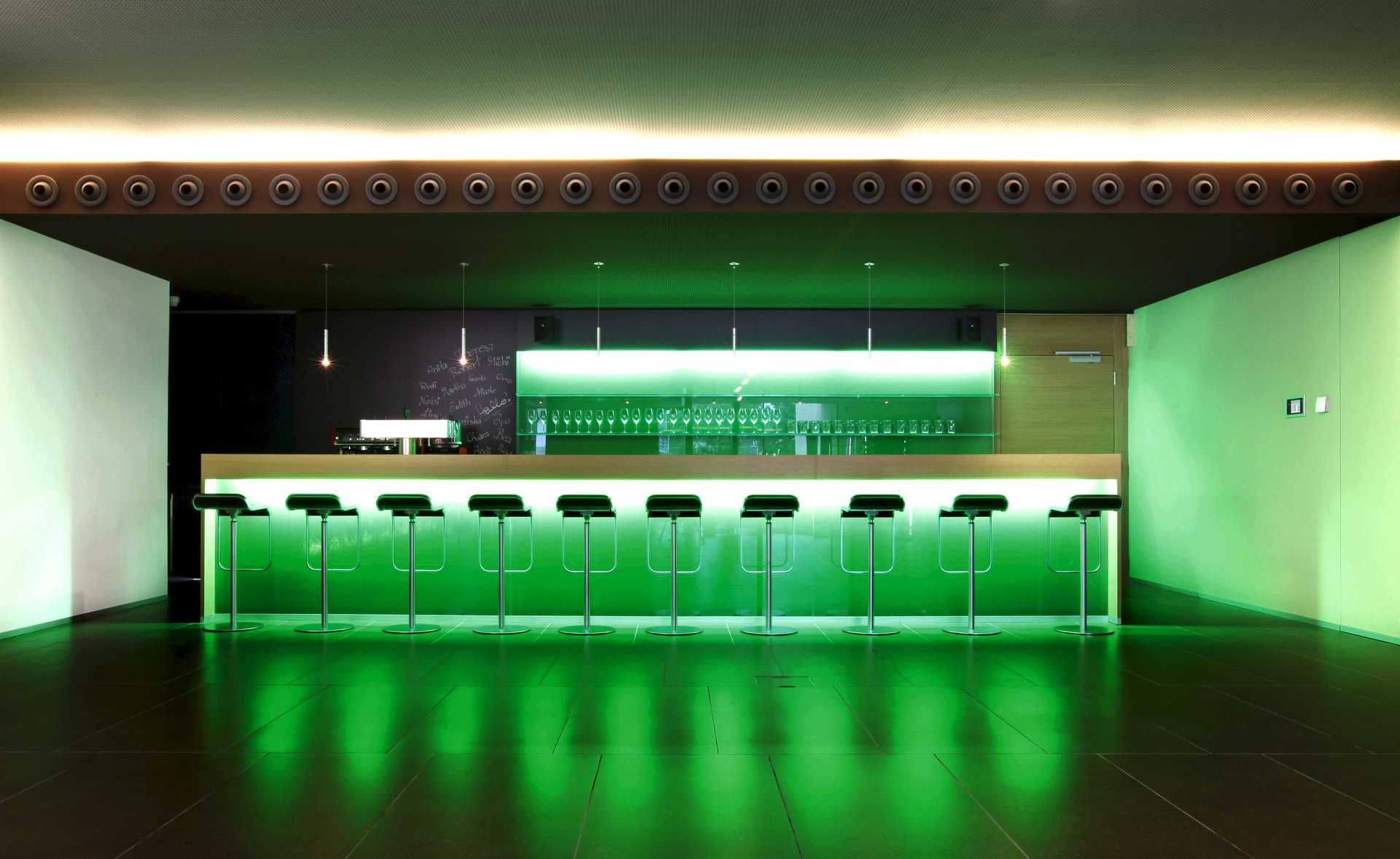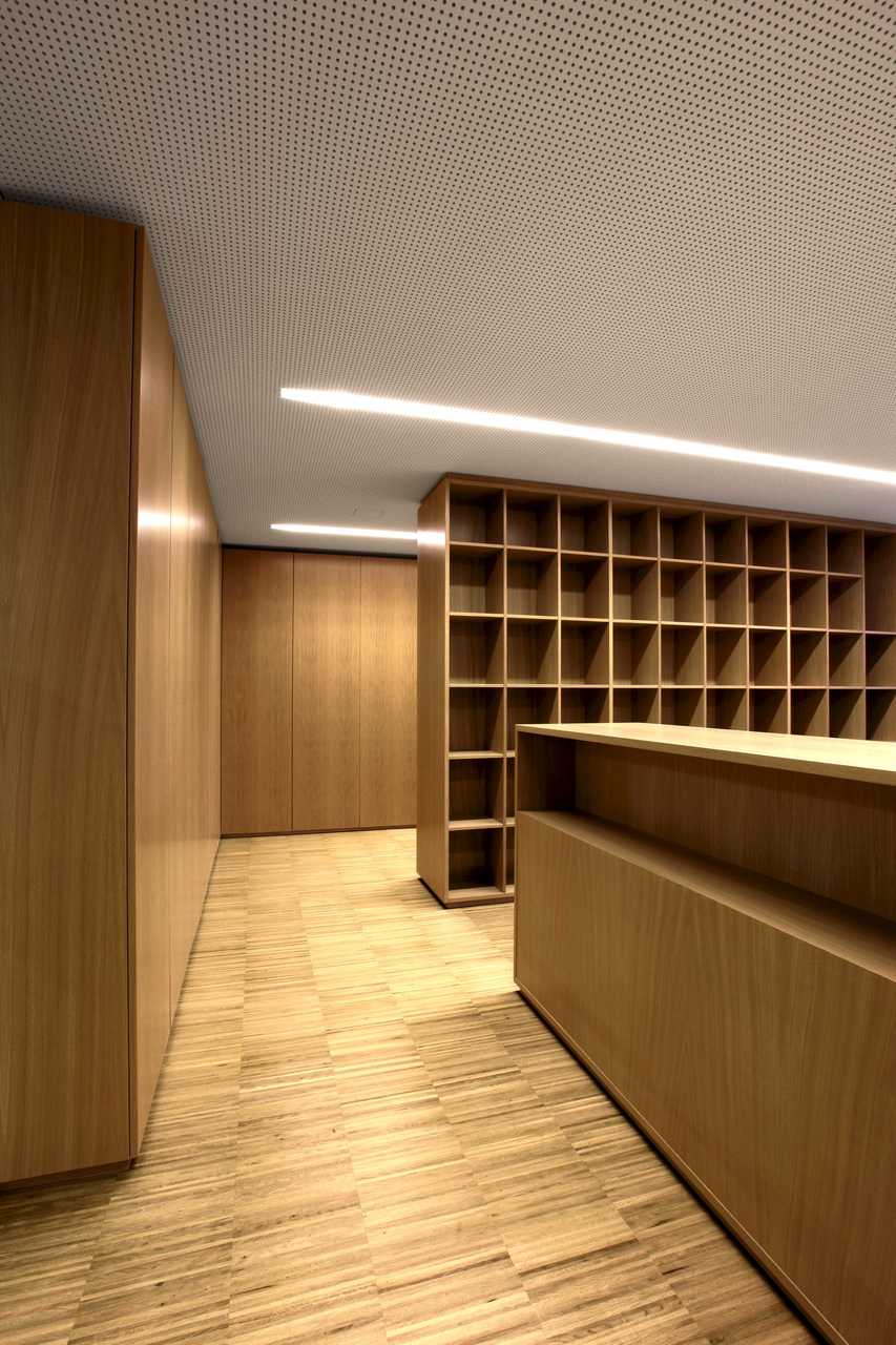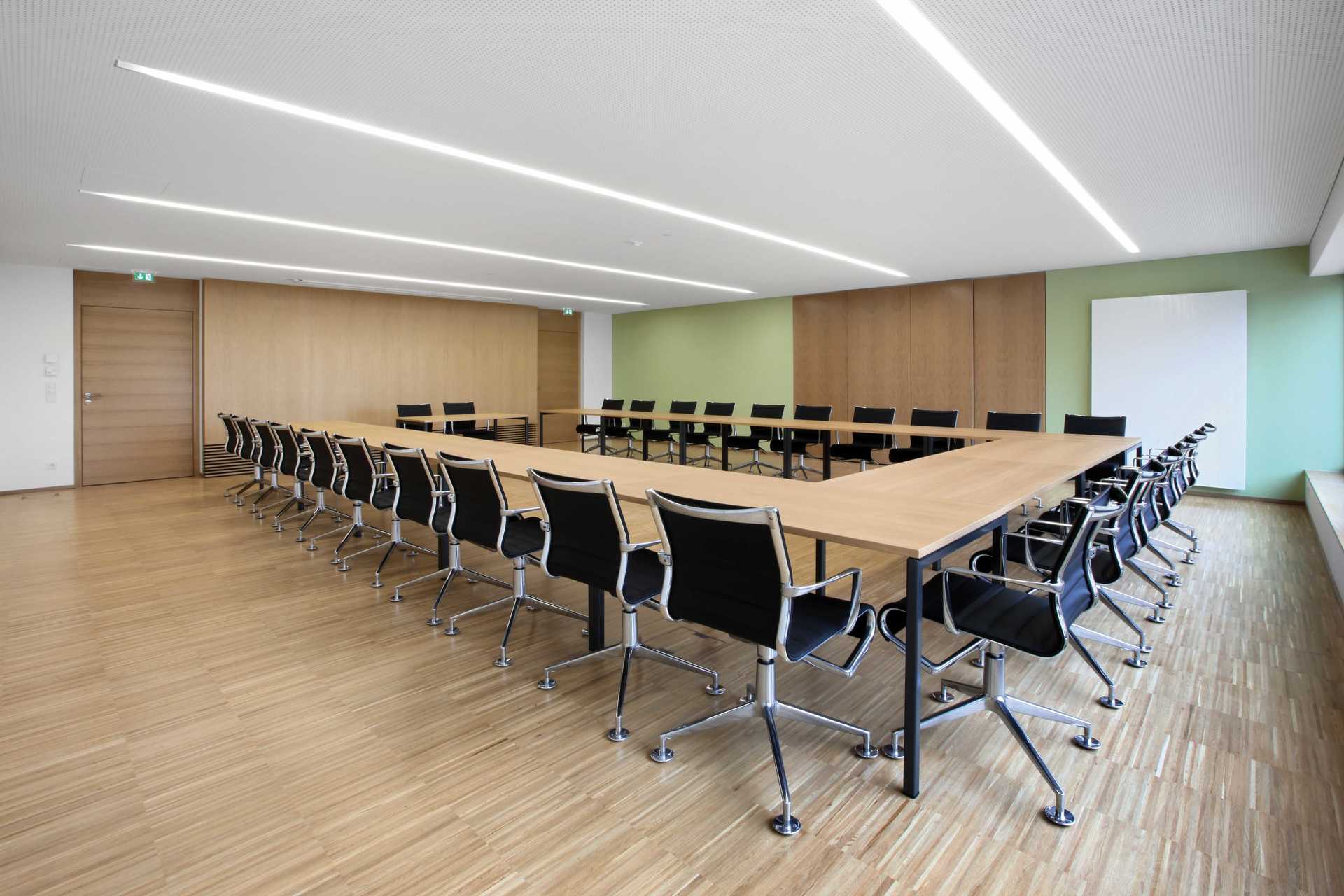 Energie | Das Gebäude ist mit hochwertiger Wärmedämmung eingepackt. Passivhausfenster ersetzen die alten aus Metall. Die Wärmeversorgung und Kühlung erfolgt zentral mit der Sole-Wasser-Wärmepumpe über neun Erdsonden, die bis zu zweihundert Meter in die Tiefe reichen. Außer für die Pumpen entsteht kein zusätzlicher Energiebedarf. Niedertemperaturradiatoren sowie die üftungsanlagen verteilen die Wärme im Gebäude. Saal und Foyer werden mittels Fußbodenheizung temperiert, alle Räume haben kontrollierte Be- und Entlüftung. (Text: Martina Pfeifer Steiner)
