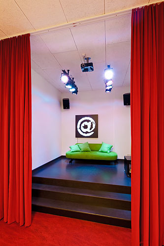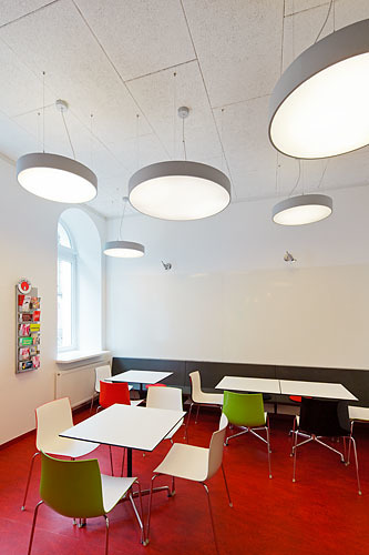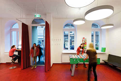 Besonderen Wert legten die jungen Planerinnen darauf, dass es sowohl Platz für Aktivität, Bewegung und Geselligkeit, als auch für Rückzugsmöglichkeiten gab. So entstand die Idee eines „Kuschelraums“, der grüppchenweise genutzt werden kann. Eine kleine Überraschung war der Wunsch, auf den Fensterbänken sitzen und plaudern zu können. Die flexible Möblierung des Hauptbereichs ermöglicht diverse Nutzungen wie offener Cafébereich, Sitzungsraum, Speisesaal, Werkstatt, Platz für Spielestationen, der zweite Abschnitt dient als gemütliche Sitzecke, Bühne, Tanzfläche, Kinosaal, Yogakursraum oder Tischfußballzimmer.