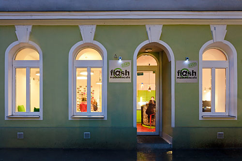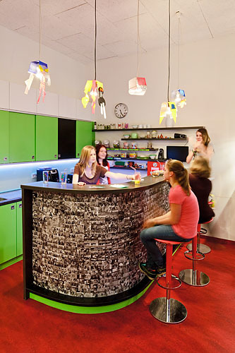 Die Architekt:innen kamen dem Wunsch der Mädchen nach, sich im Lokal auch selbst „verewigen“ zu können. So wurde die Bar mit einer Fotoplatte gestaltet, Barlampen in Selbstbauweise errichtet und mehrere beschreibbare Wandflächen bieten Platz für die Kommunikation und die persönliche Handschrift. Das „flash Mädchencafé“ hatte bereits in seiner Entstehung einen Mehrwert für die Nutzerinnen, indem die Jugendlichen gestalterisch in ihre real geformte Umwelt eingreifen konnten. (Text: Architekten, redaktionell überarbeitet)