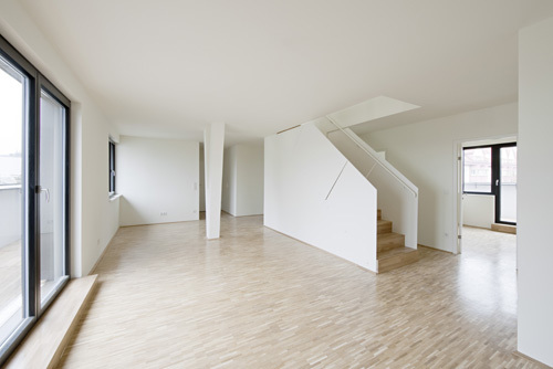 Ein großzügig dimensionierter, heller Lobbybereich empfängt die Bewohner mit einer offenen Atmosphäre. Diese wird innerhalb der zentralen Erschließung über partielle Öffnungen zur Hofseite konsequent weitergeführt und zeigt sich auch in den Nord-Süd durchgesteckten Wohnungen. Das Erleben des weitblickWIEN und des nahblickPARK ist das Grundprinzip jeder Wohnung, die Grundrisse ermöglichen unterschiedliche Blickbezüge. Der gemeinschaftlich genutzte Gartenbereich wird durch private Wohnfreiräume (Balkone, Dachterrassen) ergänzt.