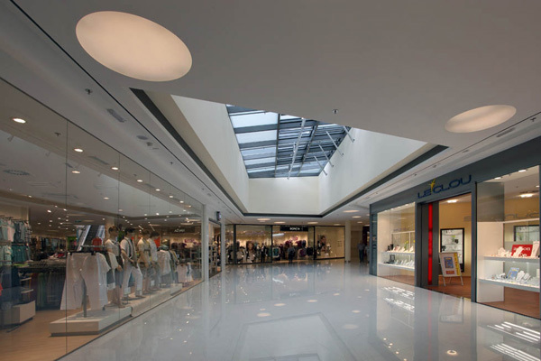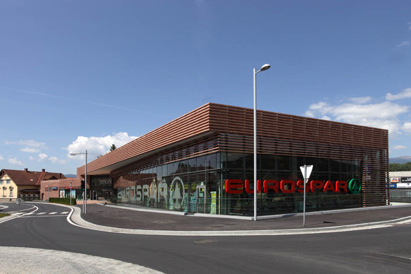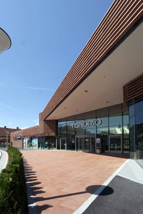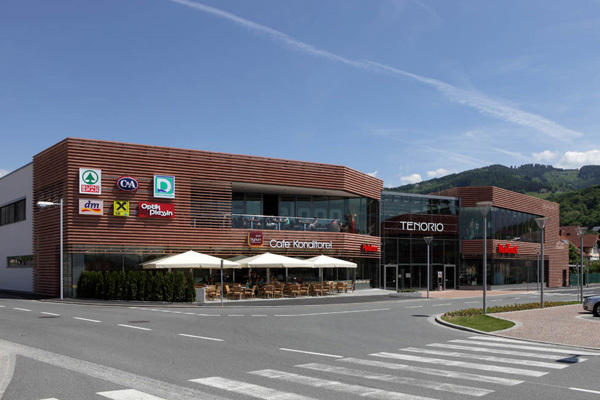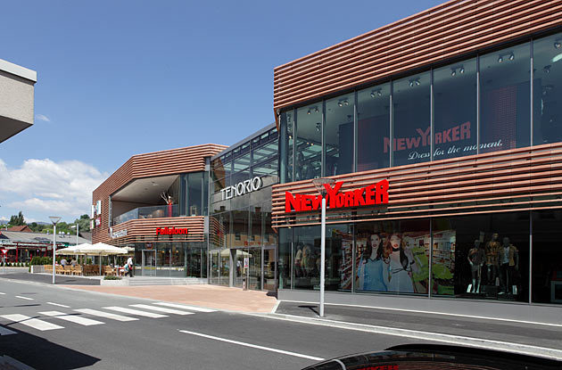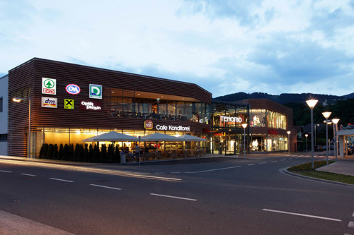 Eine Mall erschließt im EG ca. 15 Kleinshops, 3 Gastronomiebetriebe und einen Eurospar. Zwei Großshops werden als „Durchstecker“ ins OG ausgebildet, wo sich auch noch die Backstube für eine darunterliegende Konditorei befindet.