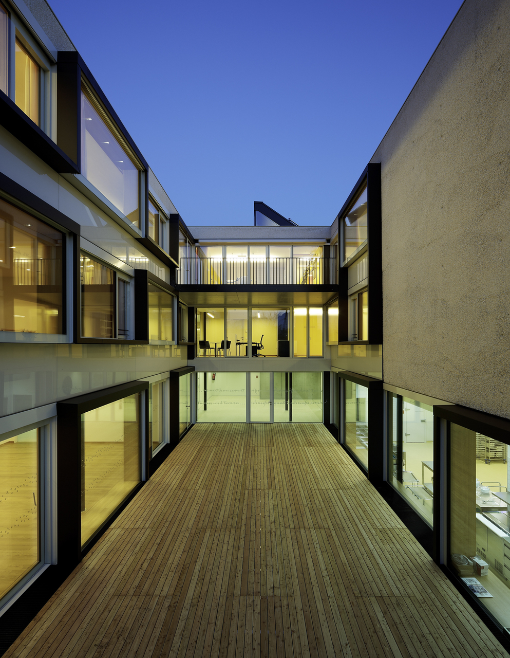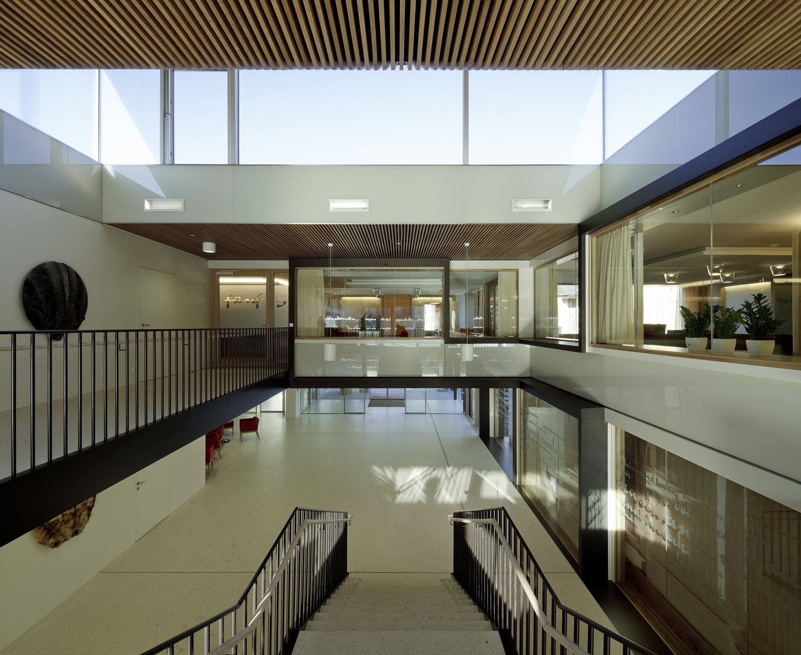 Dieses setzt sich im Inneren des Atriums fort. Großflächige Glassheds durchfluten das Foyer mit Licht. Fünf Wohngruppen – drei davon im Obergeschoß - orientieren sich mit ihren Wohnzimmern zum Innenhof. Je zwölf Zimmer umrahmen L-förmig die gemeinsame Zone. So kommunikativ und zusammenschauend diese Bereiche sind, so privat und nach außen in die Natur gerichtet sind die Zimmer. Die wandfüllenden Fensterelemente sind zweiteilig: Fixverglast mit tiefer Fensterbank, als Blumenfenster oder Tisch nutzbar, und ein öffenbarer Flügel. Materialien im Inneren sind Eiche massiv, weiße Trockenbauwände, lackierte Mehrschichtplatten oder Rigips, geschliffener Betonboden, ein weißer Terrazzo.