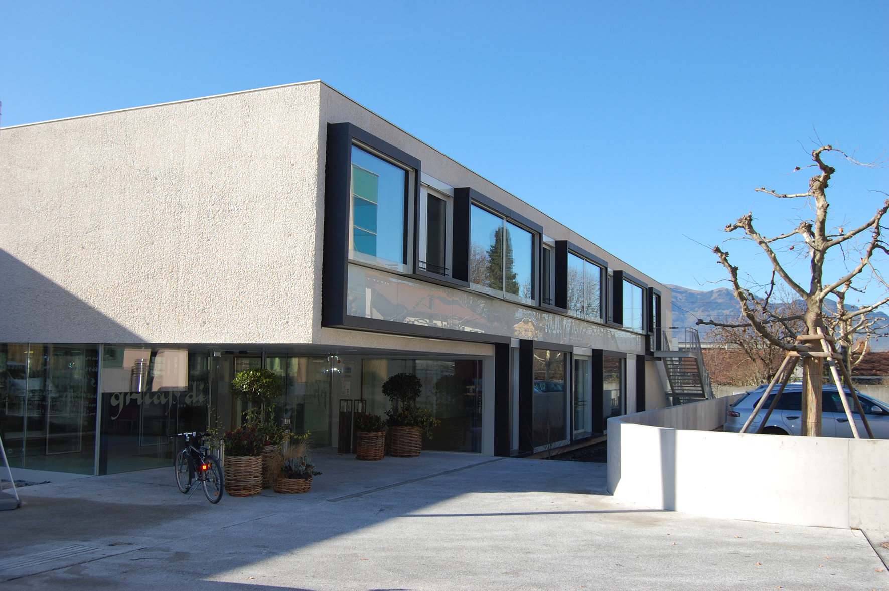 Das massiv unterkellerte Bauwerk ist in Stahlbetonskelettbauweise ausgeführt. Vorgehängt ist die Fassade, schwebend, mit deutlichem Abstand zum Erdboden. Die geschlossenen Flächen sind in weißem Ortbeton gefertigt. Eine besonders haptisch erfahrbare Struktur wird durch die Schalung erreicht. Oberflächenverzögerer wird aufgesprüht und der Beton nach dem Ausschalen mit hohem Wasserdruck abgewaschen. Vorgefertigte Fensterelemente ziehen sich scheinbar endlos um und in die Gebäudeteile. Die Multibox ist bis in Brüstungshöhe mit hinterlüfteten Glasflächen verkleidet, über die Fensterrahmen läuft eine dunkelbraune Linie aus eloxiertem Aluminium. Durch kontrollierte Be- und Entlüftung wird Niedrigenergiestandard erreicht.