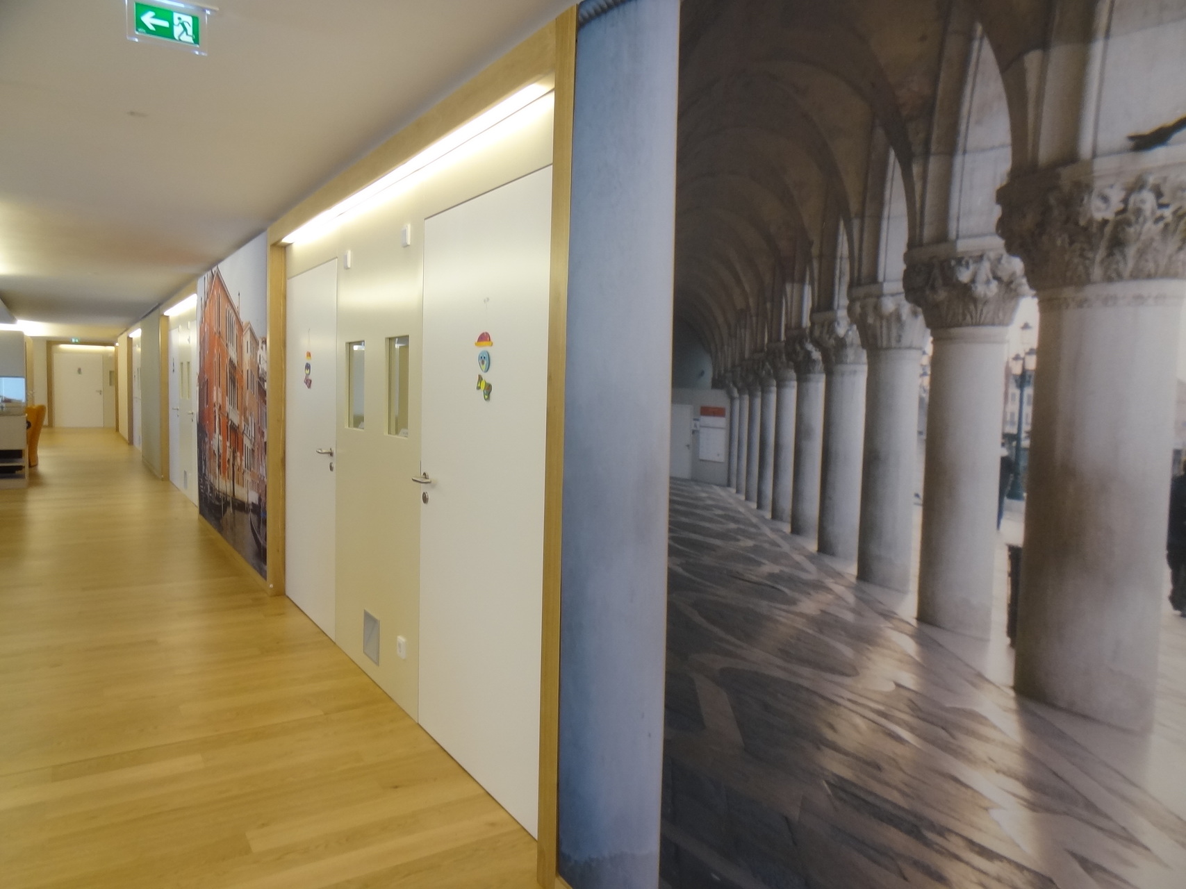 Uta Belina Waeger „S´FREI HA MITANAND“ Ein Kunst – Sprach – Leit - System | Mundarteigentümlichkeiten, die von den Senioren leicht verstanden werden sind auf allen Glastrennwänden und Türen aufgebracht, als Sicht- und Sicherheitsschutz. (Text: Martina Pfeifer Steiner)