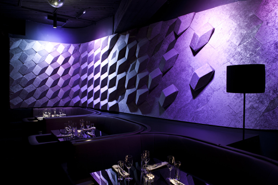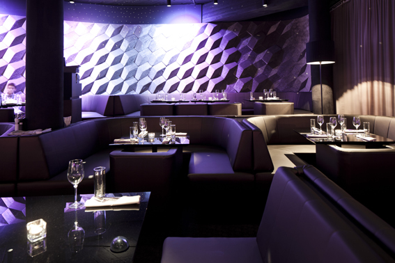 Rund um diese Skulptur wurde der Essbereich arrangiert. Um eine perfekte Sicht auf die Bühne zu gewährleisten, wurden die Esstische auf drei verschiedenen Stufen platziert. Der Tanzbereich wurde vor der Bühne angelegt und ist damit ein weiterer Hingucker für die Gäste. Durch die Positionierung mit der Bühne und dem Dancefloor in der Mitte wird für den Essbereich eine ganz besondere Intimität geschaffen, ohne dass er ausgeschlossen wird. Die Architekten kombinieren gerne moderne Elemente mit klassischen Details – so wurde der Essbereich von der amerikanischen Bartradition der 1950er und 1960er Jahre inspiriert. Als Vorbild diente Quentin Tarantinos „Jack Rabbit Slims Twist Contest“ aus seinem Film „Pulp Fiction“. (Text: Architekten, redaktionell erweitert)
