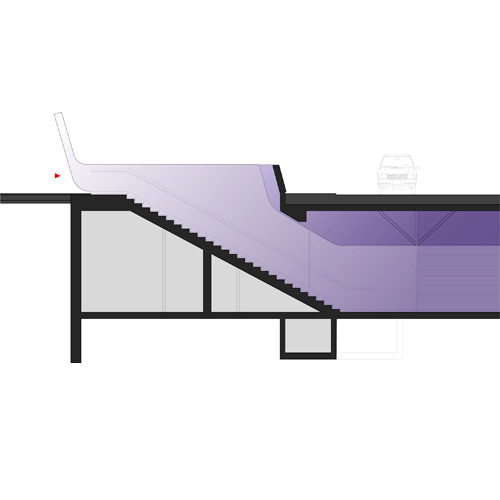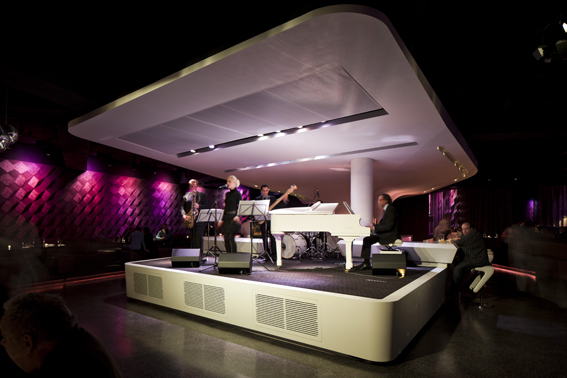 Der Eingangsbereich zur Albertina Passage befindet sich direkt vor der Wiener Staatsoper. Die Gäste werden die Stiegen hinab durch einen S-förmigen „Tunnel“ vorbei an der Rezeption und der Garderobe in den Hauptbereich geführt. Das Erste, was beim Betreten des Clubs ins Auge sticht, ist die futuristisch anmutende weiße Skulptur in der Mitte des Raumes. Sie bildet das Kernstück des Designs und beinhaltet Funktionen wie die Bühne für Livemusik, das DJ-Pult, zwei Bars und eine Lounge. Für die Bühne wurde Korian, ein sehr multifunktionales Material, verwendet. Dies lässt den Eindruck einer einzigen, aus einer Form gegossenen Oberfläche der Bühne entstehen. Als Kontrast dazu dient die Wandgestaltung, bei der ein besonders warmes Material verwendet wurde. Durch ein spezielles 3-D-Design spielen die Wände mit Licht und Schatten.