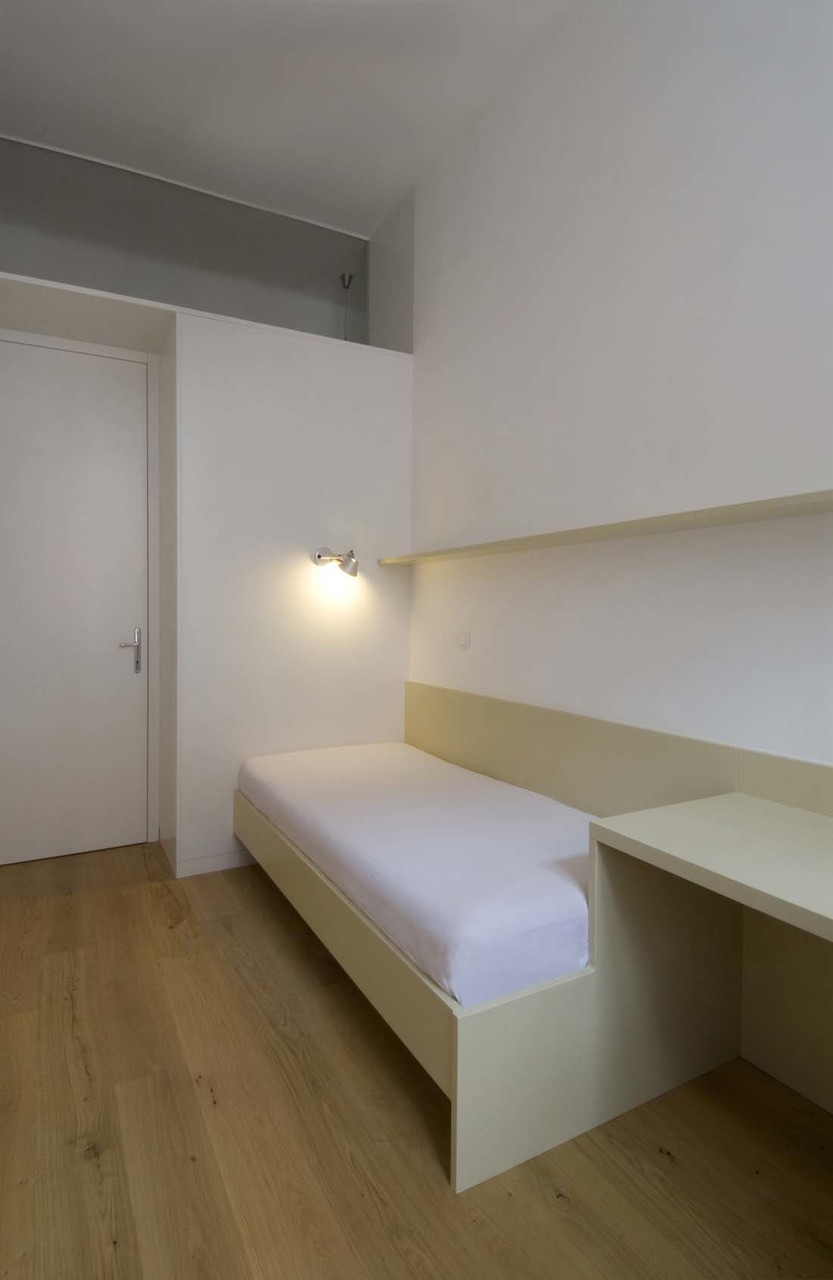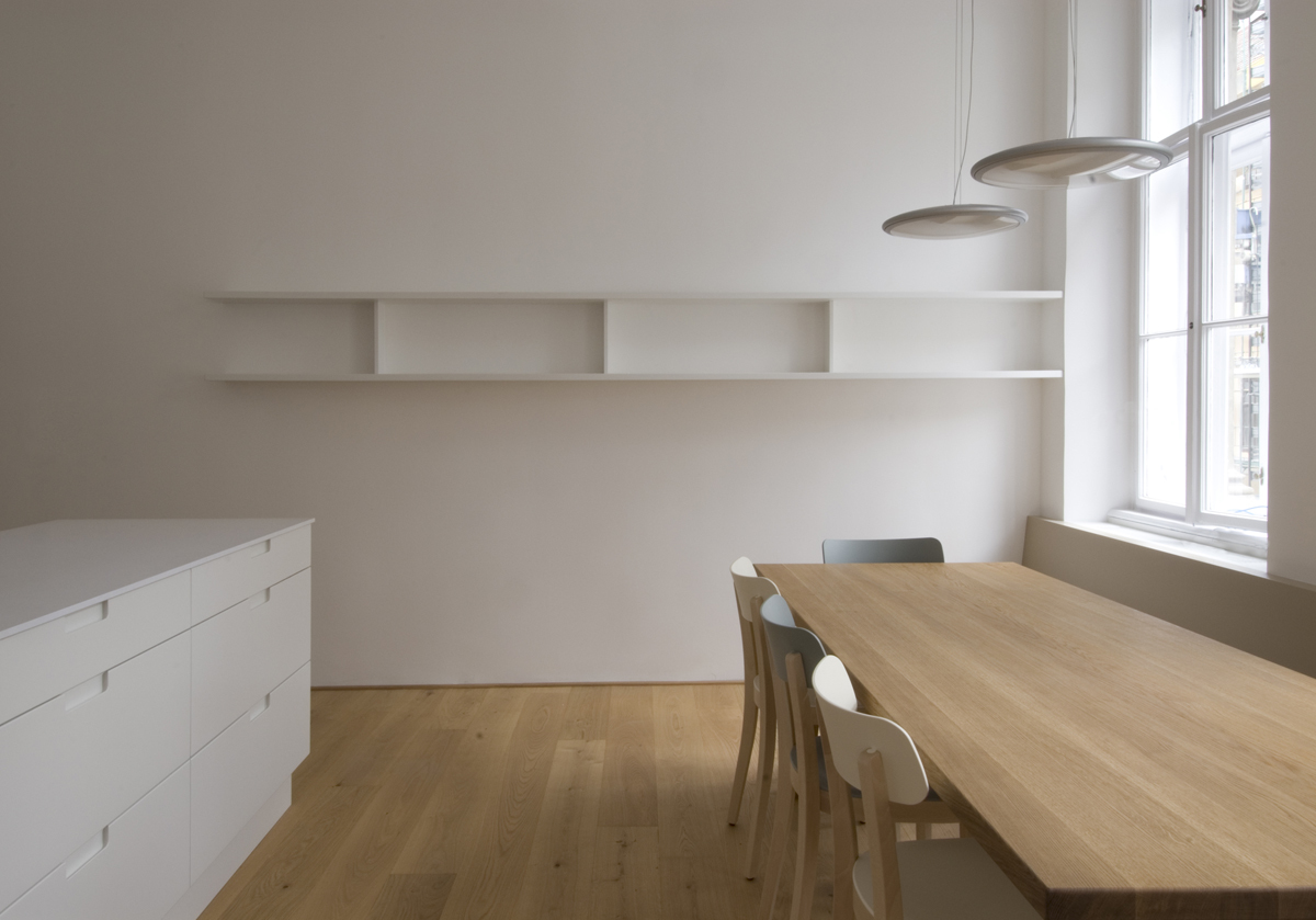 Eine Neuorganisation des Grundrisses ermöglichte eine Umsetzung des geforderten Raumprogramms ohne aufwändige Bauarbeiten. Die vormals schlecht belichtete Küche bildet nun den hellen Mittelpunkt innerhalb der Wohnung mitsamt fließenden Übergängen in die übrigen Wohnbereiche. Rund um die neu geschaffenen Kinderzimmer entstand gemeinsam mit dem vorgelagerten Schrankraum und dem vergrößerten Bad eine private Rückzugszone. Maßgefertigte Einbaumöbel werden als wandartige Elemente eingesetzt und schaffen den Rahmen für eine zurückhaltende, farbig abgestimmte Möblierung der Wohnung.