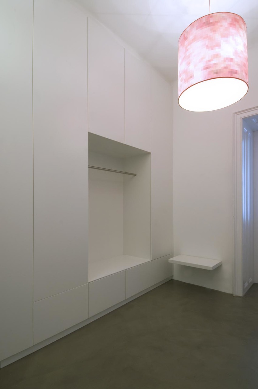Geölte Eichendielen in den Wohn- und Schlafräumen sowie Feinsteinzeug und eine mineralische Beschichtung in den restlichen Räumen fügen sich harmonisch in das Bild der gründerzeitlichen Wohnräume ein und formen eine zeitgemäße Ergänzung des Bestandes. Im Zuge der Grundrissänderung verwandelte sich auch der Eingangsbereich der Wohnung: Mit einer Garderobe und zusätzlichen Stauflächen ausgestattet bildet er nun einen großzügigen Raum zum Ankommen. (Text: Architekten, redaktionell überarbeitet)