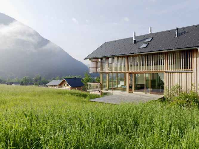 Die Fassade ist gänzlich in Holz gestaltet. Sie wechselt vor den Öffnungen von geschlossen, vertikal gegliedert auf transparent, wobei sie dort mit vertikalen Holzlatten den Filter zum Außenraum bildet, der dann in feingliedrige Lattenbrüstungen übergeht.