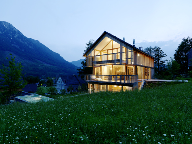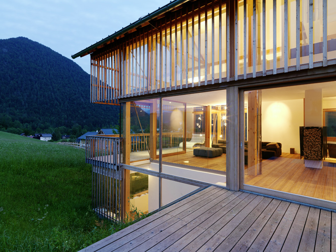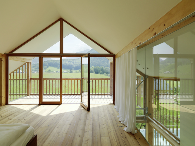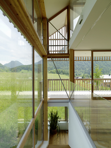Das Konzept der Offenheit, des Ineinanderfließens und die Inszenierung des Außenraumes sind im gesamten Haus spürbar. Großzügige Gebäudeöffnungen holen die Landschaft in die Innenräume. Aussparungen in den Geschoßdecken und Glasbrüstungen verbinden Erdgeschoß, Ober- und Dachgeschoß.