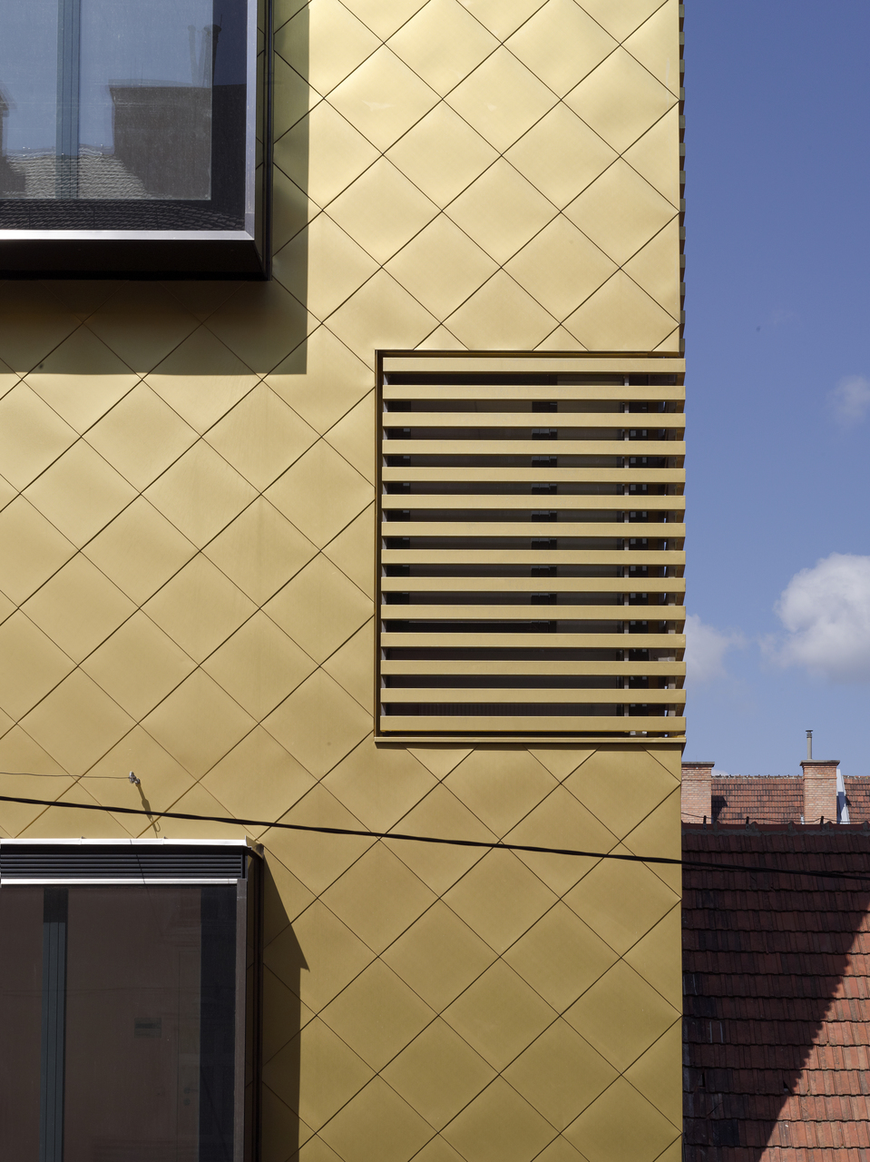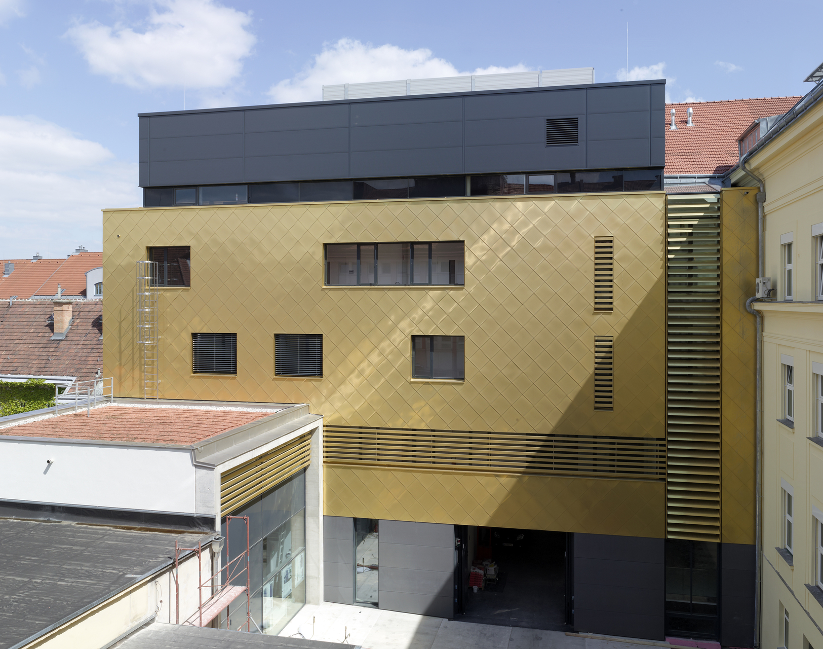 Den hochtechnischen Laborfunktionen entsprechend ist die Architektur des Gebäudes einer stringenten, auf wenigen Elementen und Farben basierenden Architektursprache verpflichtet. Um die Gestalt des Gebäudeblocks zu wahren, wurden einige wenige Höhenbezüge in den Laborneubau übernommen. Die Fassadengestaltung setzt sich aber mit Erkern, Fenstertüren und semitransparente Lamellenflächen in einer Metallschuppenfassade sehr bewusst von der gründerzeitlichen Putzfassade des Altbaues ab.