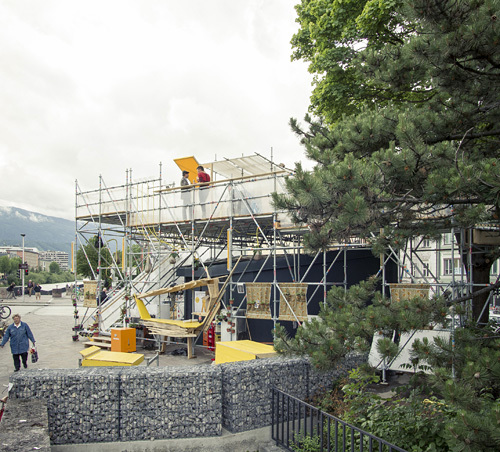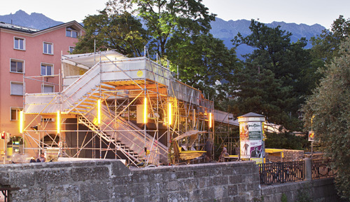 In Tirol wurde anlässlich der Architekturtage 2012 wieder gebaut. Dem Thema „anders als geWohnt“ entsprechend richtete die Tortenwerkstatt – ein Kollektiv Innsbrucker Architekturstudierender – eine „stattSTUBE“ ein. Ein bewohnbares, öffentliches Objekt, in dem man sich mit Freund:innen treffen, die Mittagspause verbringen, Essen, Arbeiten oder einfach nur sein kann.Das verbliebene „Tortenstück“ des ehemaligen Kiosks wurde mit einem Raumgerüst eingehaust. Eine Stiege bei der Innbrücke und eine in den Waltherpark auslaufende Rampe führen hinauf in die – mit viel Liebe zum Detail – von der Tortenwerkstatt eingerichtete stattSTUBE, in der mit Strom und drahtlosem Internet auch die notwendige Infrastruktur zur Verfügung steht, die ein Wohnen möglich macht. Hängematten und -stühle unter der Stube bzw. der Rampe bieten intimere Rückzugsorte, eine von der „Bäckerei – Kulturbackstube“ realisierte Bar lädt zum Feiern ein.