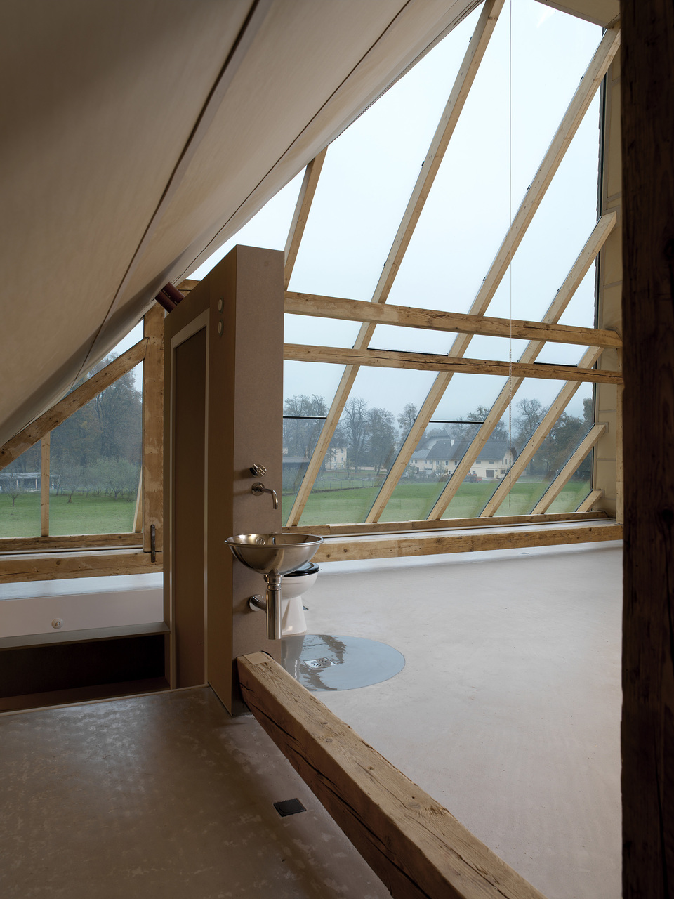 Der Freiraumbezug ist ein besonderer. In die Halle holt keine neue Maueröffnung Bilder der Landschaftsräume herein, die seine Konzentration und Neutralität untergraben würden. In der Eingangsloggia entspricht hingegen das Ersetzen der ganzen Südmauer durch eine verschiebbare Glaswand dem Denken in Räumen. Im Dachzelt wiederum ersetzt die Atelierverglasung mit Landschafts- und besonders Himmelsblick die vierte Wand. Jahreszeit, Situation, Lust und Laune und das große Spektrum räumlicher Qualitäten bestimmten die Wanderrouten der Nomaden im Haus. (Text: Norbert Mayr, gekürzte Fassung)