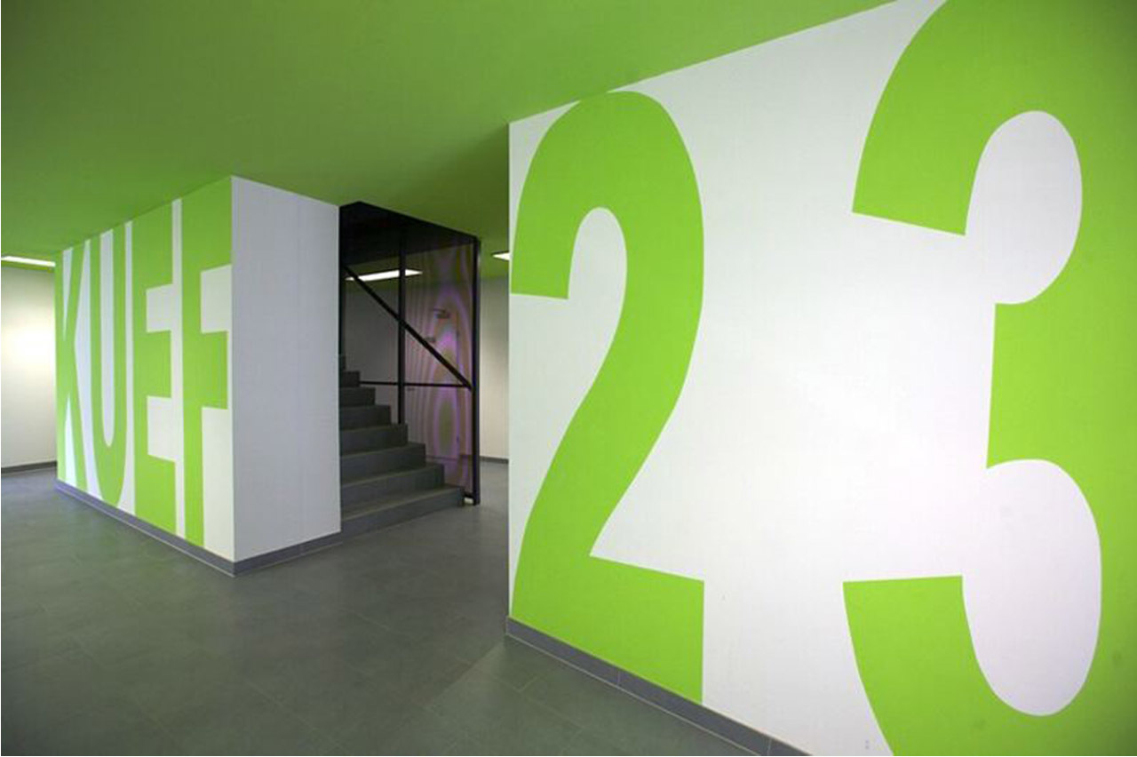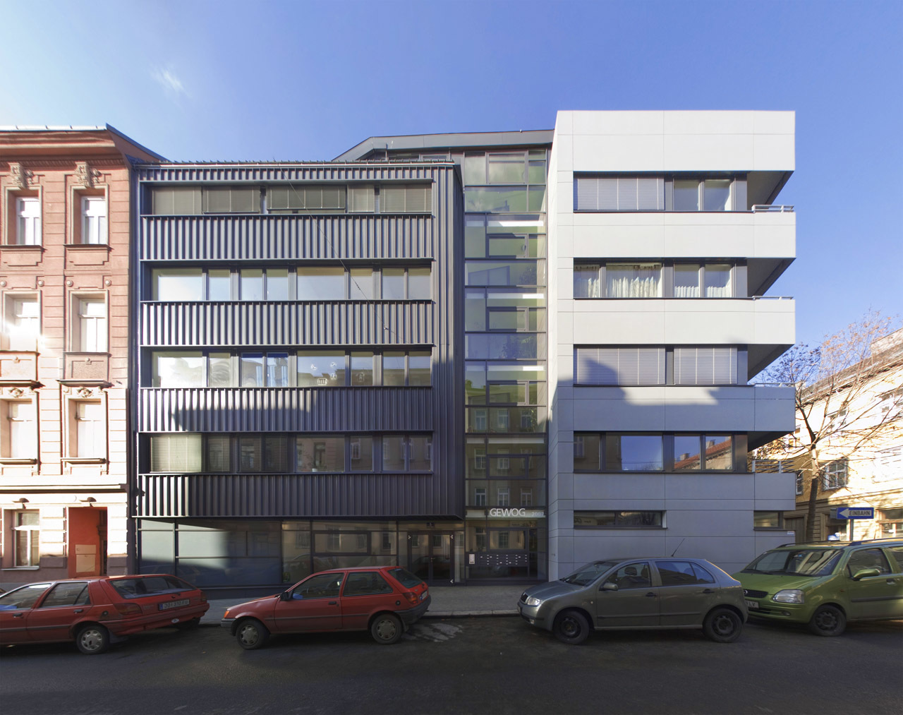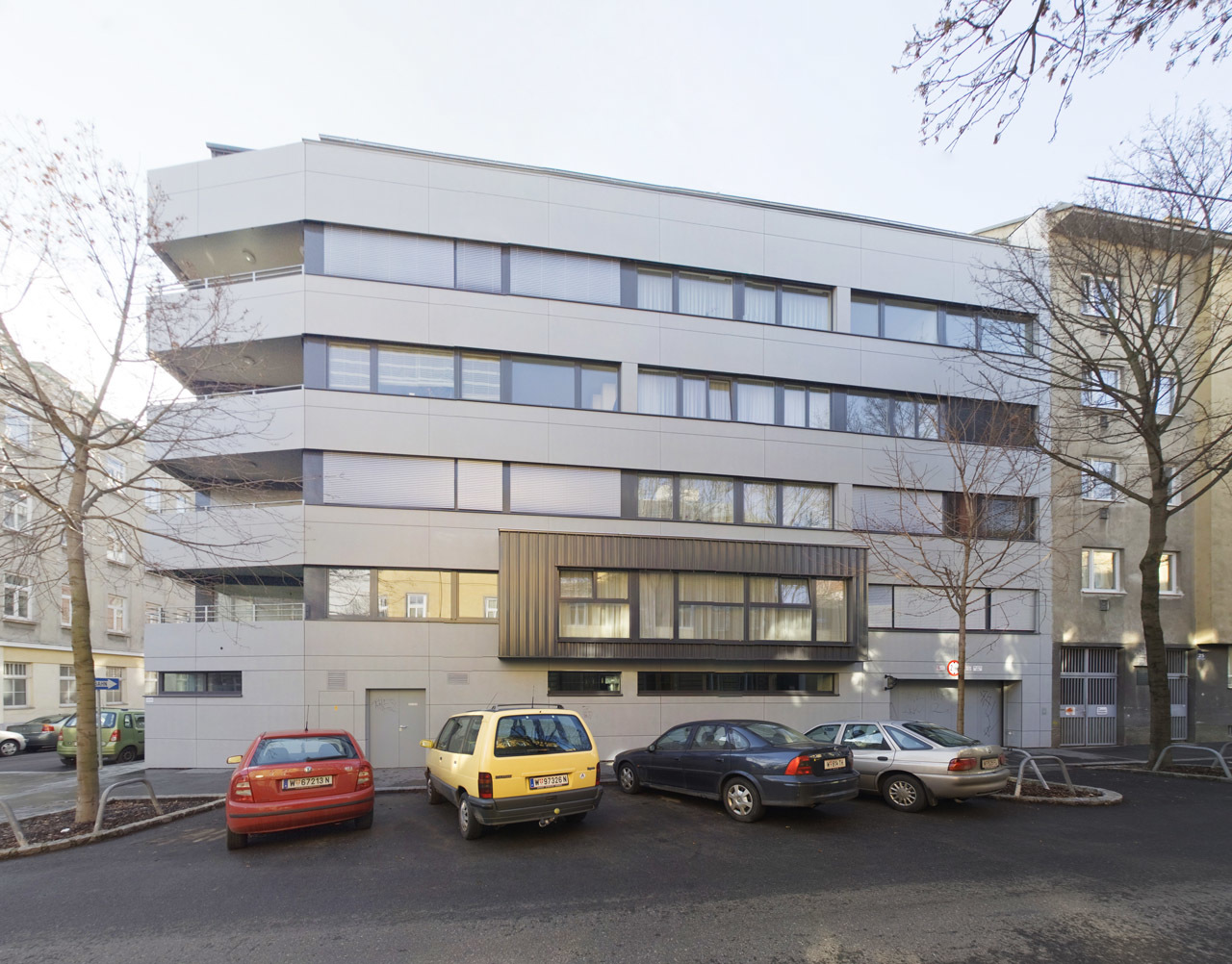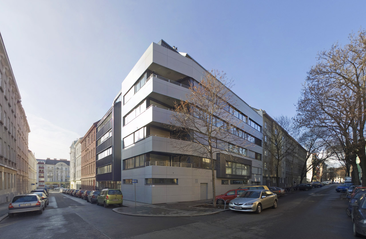 Der markante Bauteil an der Kuefsteingasse wird um die Ecke herumgeführt und überlagert und durchdrungen vom niedrigeren Gebäudeteil an der Draskovichgasse. So bilden die auch im Material unterschiedlich gestalteten Teile eine dynamische Einheit.