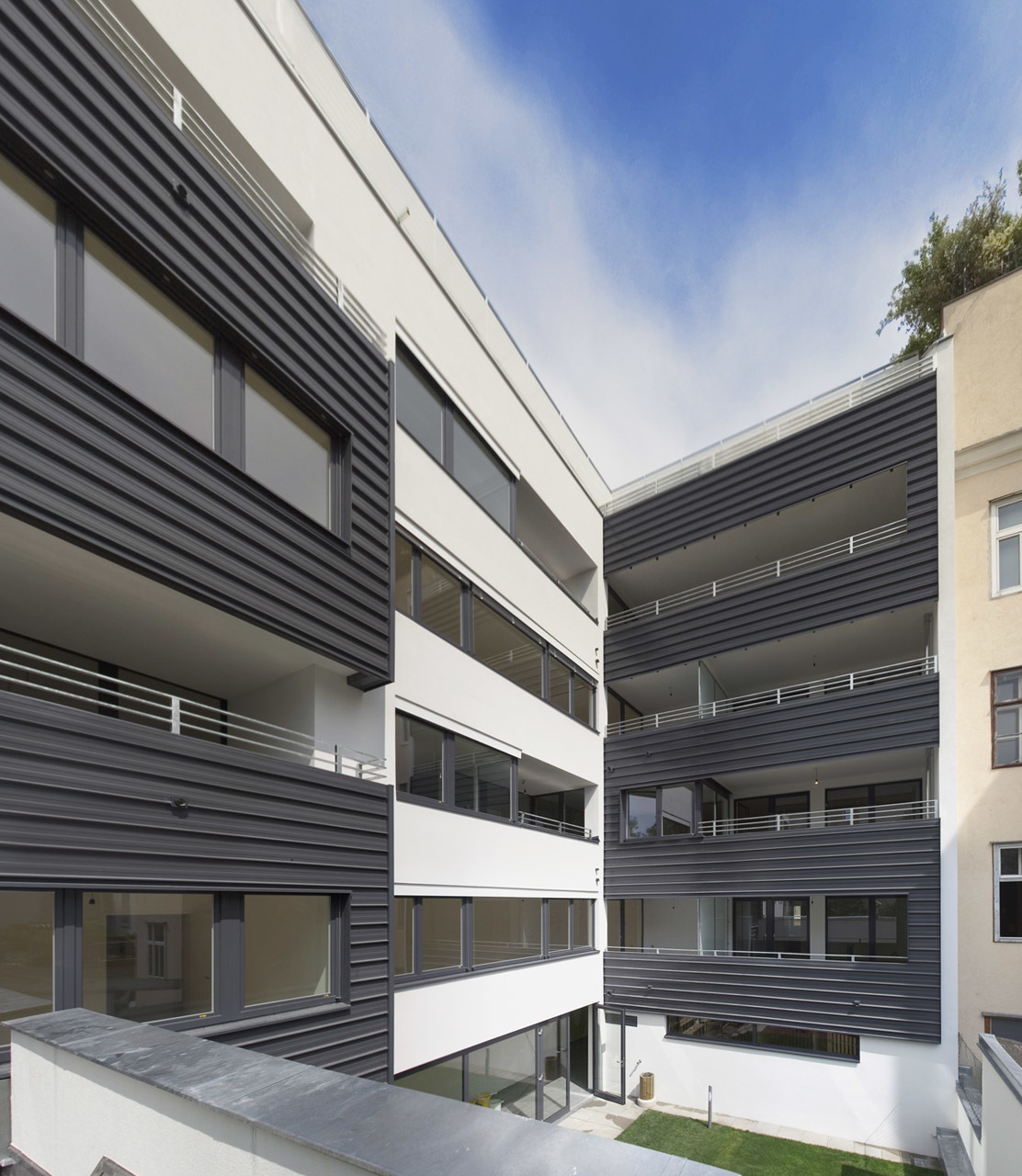 Erreicht wird diese Orientierung durch ineinander verschränkte Maisonettwohnungen. Diese Wohnungen bieten einen Bezug zu den beiden sehr unterschiedlichen Qualitäten der Hof- und Straßenseite. (Text: Architekt:innen)