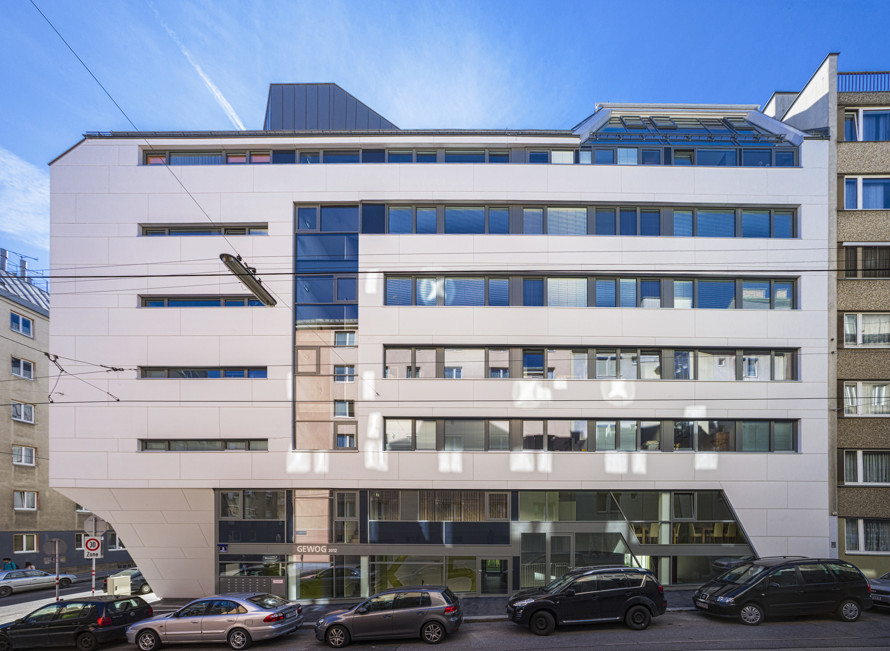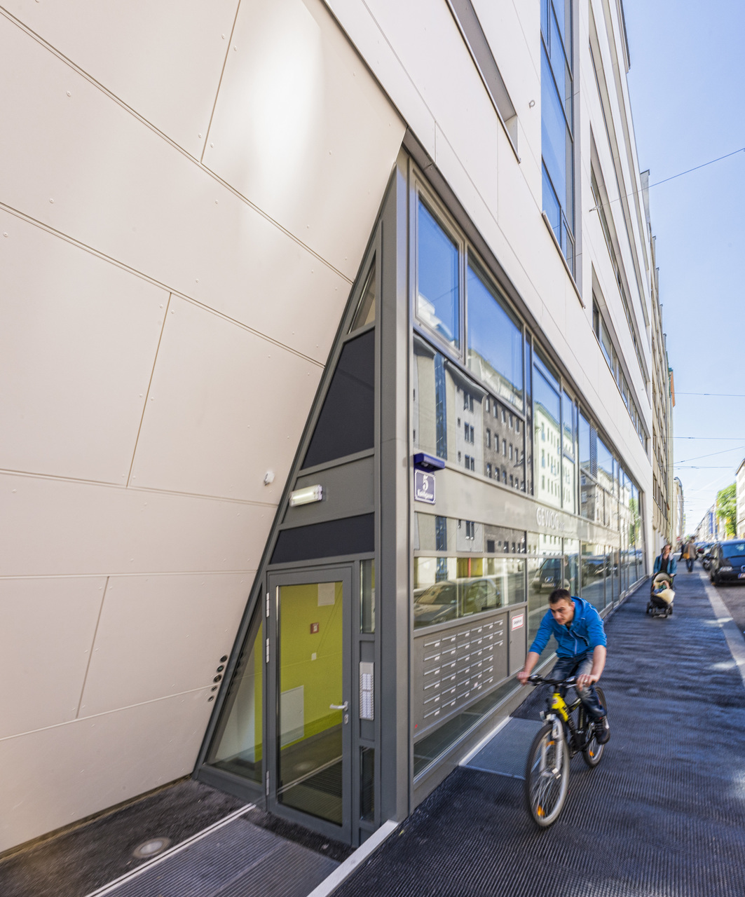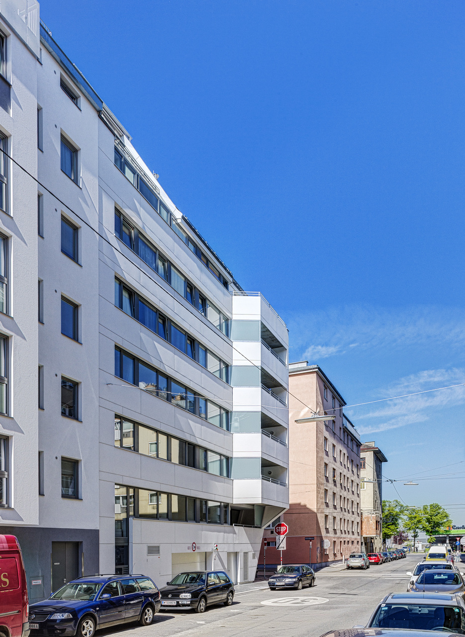 Einen wichtigen Beitrag zur Belebung der Erdgeschosszone stellt das Geschäftslokal in der Knöllgasse mit seiner Auslagenfront dar. Daneben befinden sich der verglaste Foyerbereich für das Wohnhaus sowie eine Waschküche, Parteienkeller und Abstellflächen für Fahrräder und Kinderwägen. Die unbedingt notwendigen Nebenräume wie Müllraum und Garageneinfahrt wurden in der Buchengasse in einer gestalterischen Einheit zusammengefasst. Die Glasfassade in der Knöllgasse erstreckt sich vom Erdgeschoss über den Gemeinschaftsraum, der straßenseitig im ersten Stock liegt.