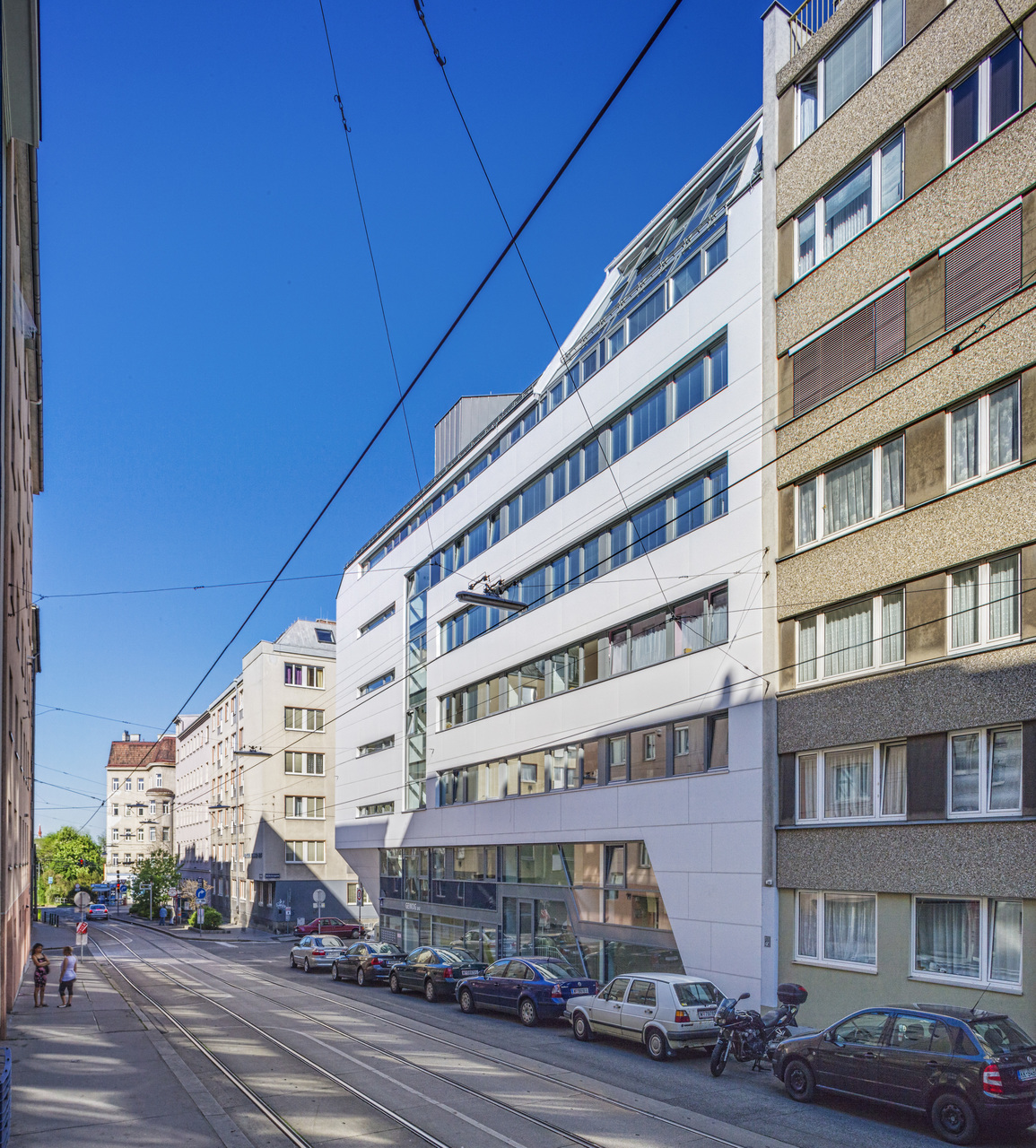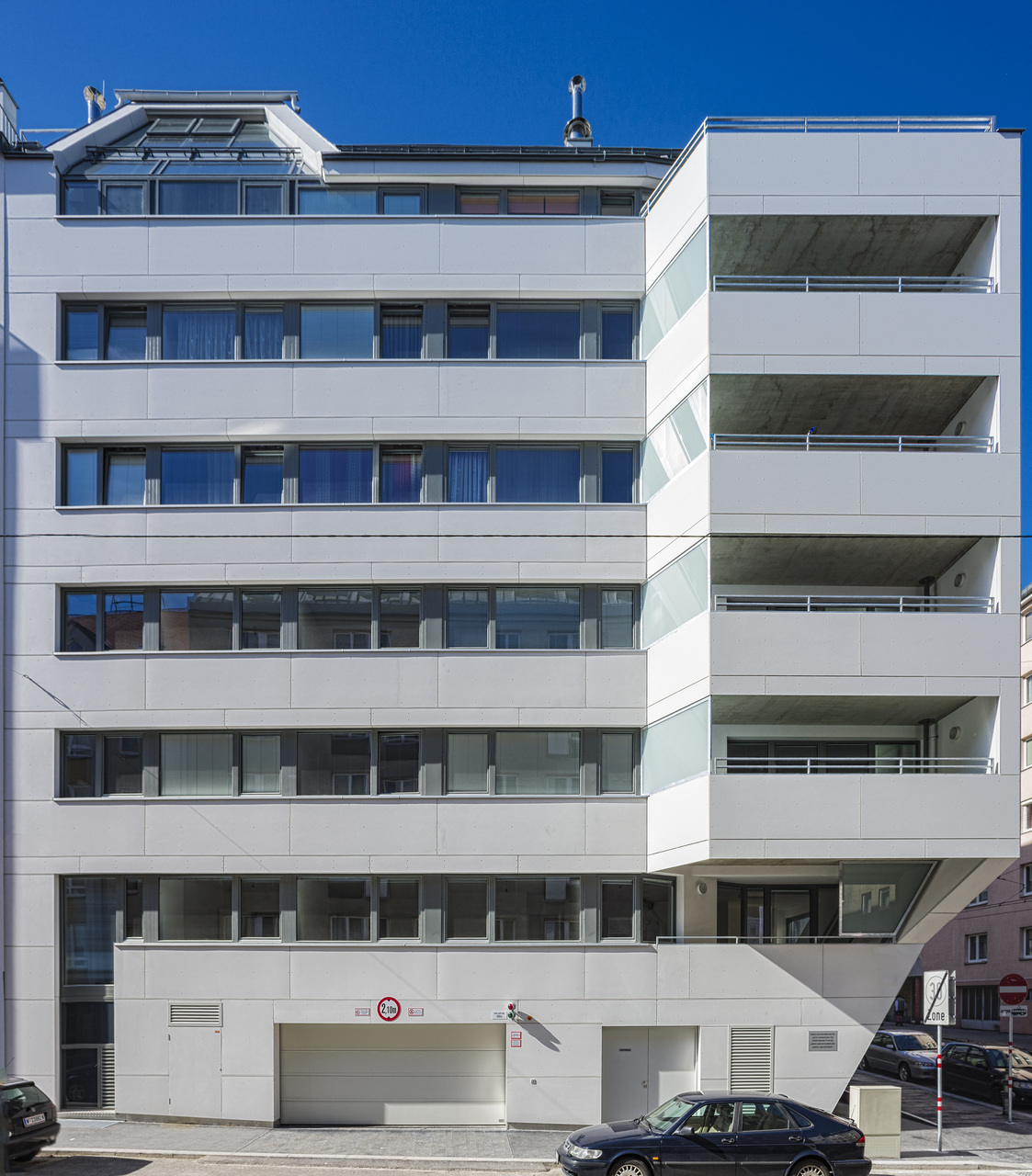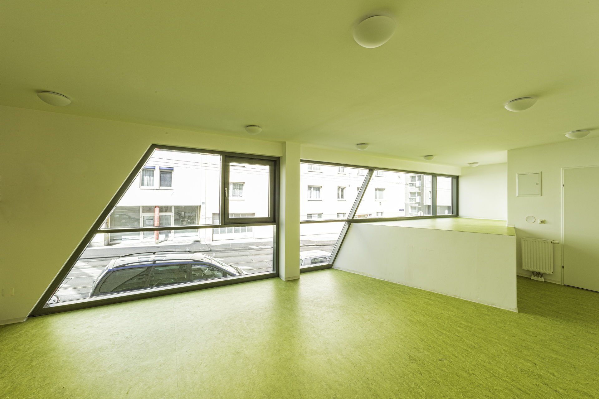 Einen wichtigen Beitrag zur Belebung der Erdgeschosszone stellt das Geschäftslokal in der Knöllgasse mit seiner Auslagenfront dar. Daneben befinden sich der verglaste Foyerbereich für das Wohnhaus sowie eine Waschküche, Parteienkeller und Abstellflächen für Fahrräder und Kinderwägen. Die unbedingt notwendigen Nebenräume wie Müllraum und Garageneinfahrt wurden in der Buchengasse in einer gestalterischen Einheit zusammengefasst. Die Glasfassade in der Knöllgasse erstreckt sich vom Erdgeschoss über den Gemeinschaftsraum, der straßenseitig im ersten Stock liegt.