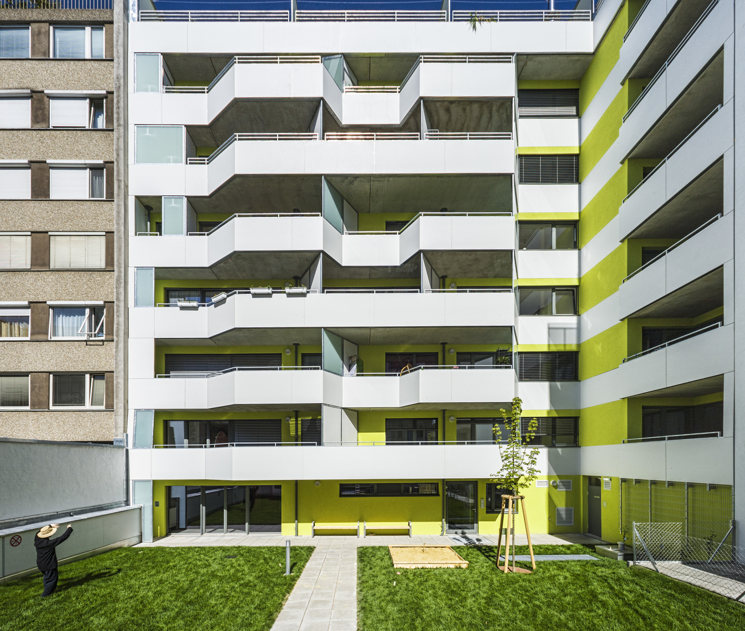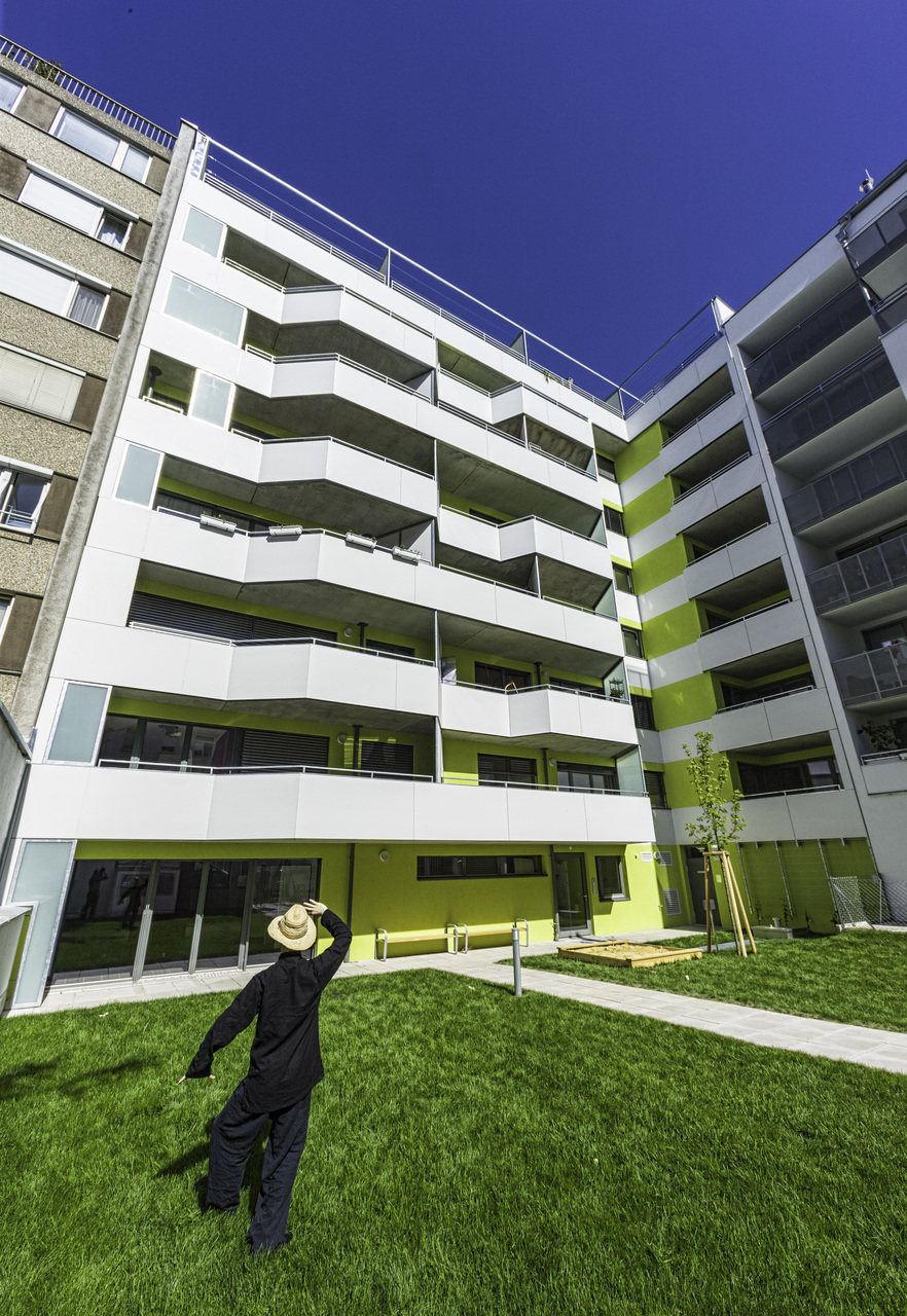 In den 1970er Jahren wurden in Wien erstmals private Hofflächen eines Häuserblocks mit viel Engagement, Aufwand und unter langwierigen Diskussionen zu einer gemeinsamen, großen und besser nutzbaren Freifläche zusammengelegt (Plan Quadrat, 1040 Wien). Für das Wohn- und Geschäftshaus Knöllgasse 5 sowie die drei angrenzenden Liegenschaften ist die gemeinsame Nutzung des Blockinnenbereichs von Beginn an vorgesehen. Der Freiraum bietet verschiedene Zonen für Spiel und Aufenthalt und wird von den Bewohnern der vier Wohnhäuser genutzt. (Text: Architekt, redaktionell überarbeitet und erweitert Martina Frühwirth)