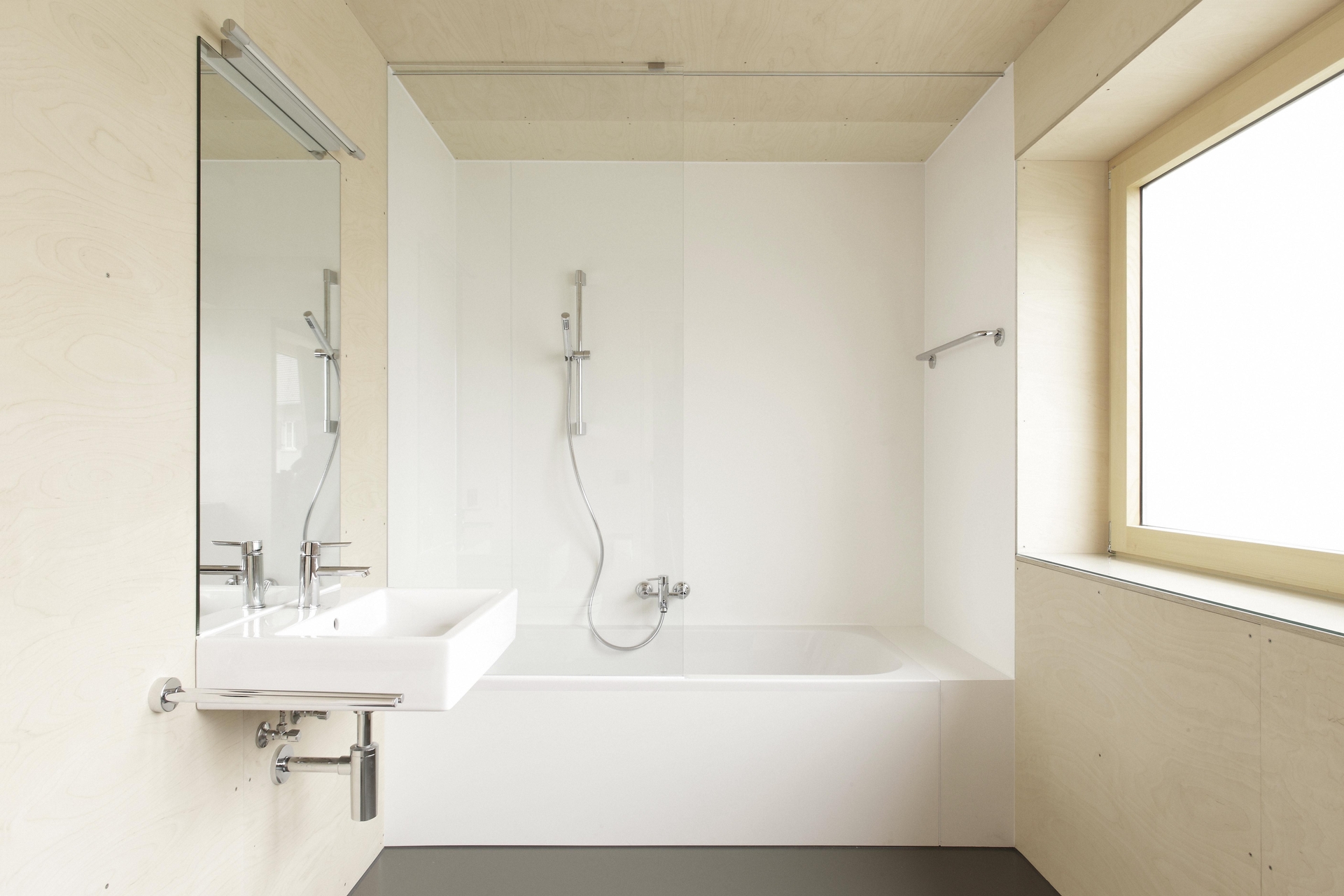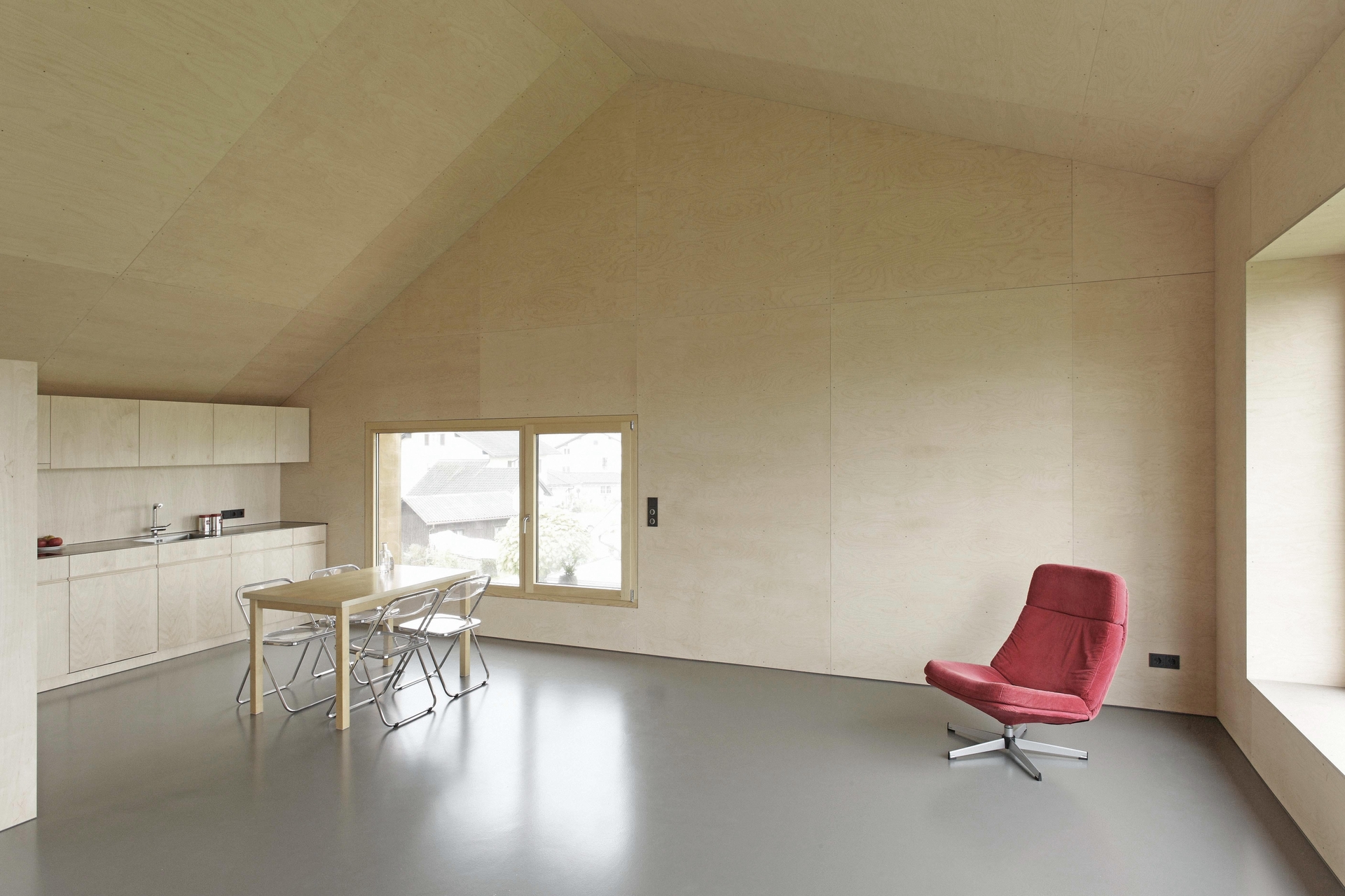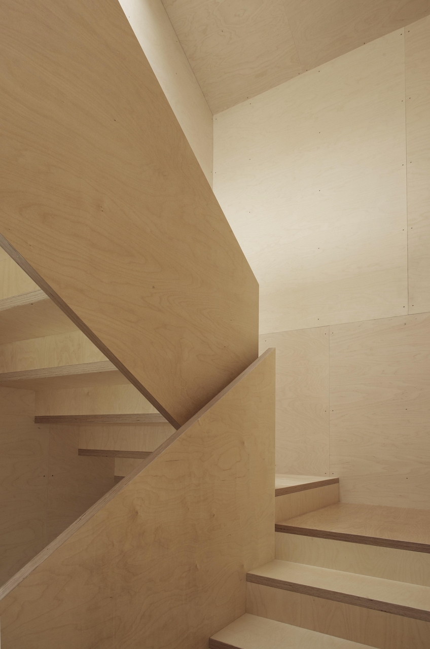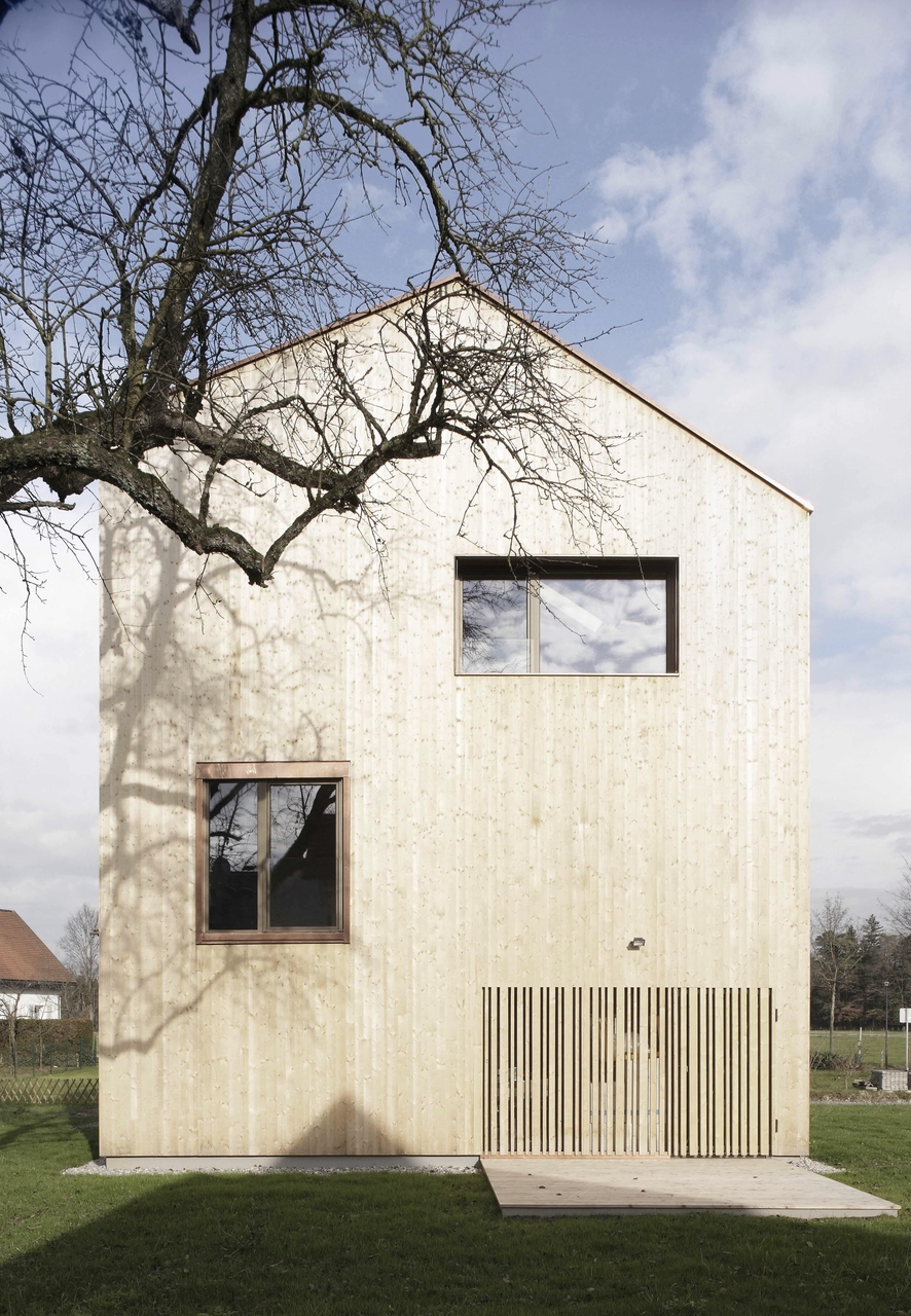 Um die Bauzeit zu minimieren und die Kosten möglichst gering zu halten, wurde mit vorfabrizierten Holzelementen geplant und gebaut. Die hinterlüftete Fassade aus Fichtenholz unterstreicht durch die vertikale Ausrichtung der Latten zusätzlich die Höhe des Gebäudes. Innen kleiden sichtbar verschraubte Sperrholzplatten aus Birkenholz Wände und Decken komplett aus und schaffen in der Reduziertheit der Materialien helle und offene Räume. Im Obergeschoss bildet ein geschliffener Estrich, der farblos imprägniert wurde, den fugenlosen Bodenbelag.