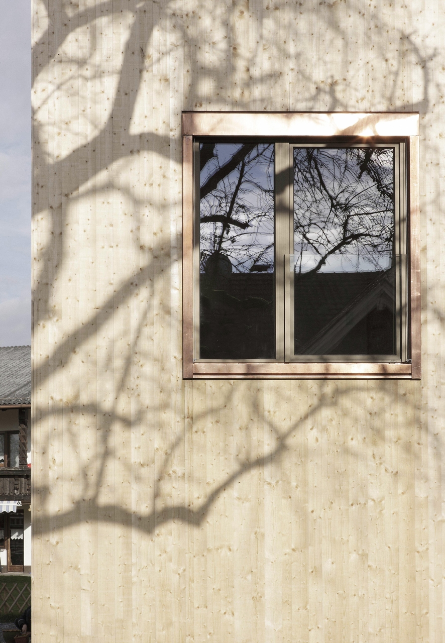 Alle Fenster sind in Position, Größe und Lage zur Wandebene Unikate und geben jedem Raum einen individuellen Charakter. Blicke auf Natur, Nachbarschaft und die Schweizer Berge werden bewusst hervorgerufen. Ein großes, außenbündiges Fenster im Obergeschoss schafft bei niedriger Parapethöhe eine Sitzbank.