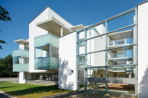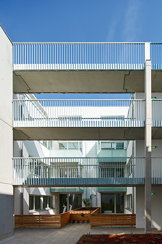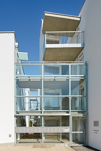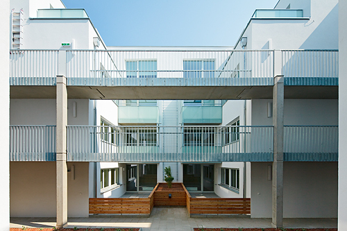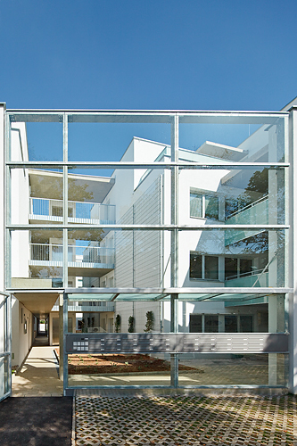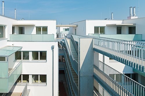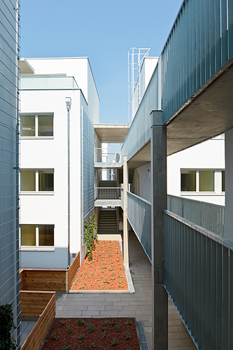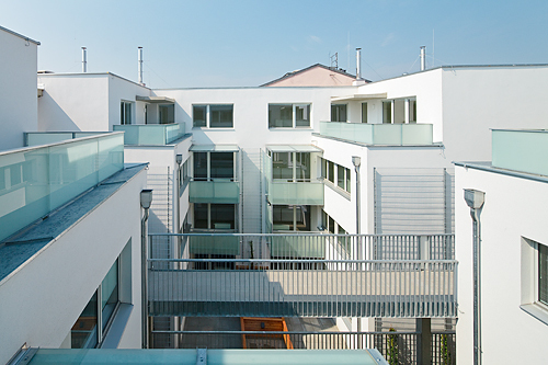 Die speziell entwickelte Bebauungsstruktur als Nachverdichtungsmodell im heterogenen Mischbaugebiet entwickelte sich aus hohen Planungsanforderungen in Reaktion auf die schwierigen Randbedingungen des Baufeldes. Im Gegensatz zur klassischen Blockrandbebauung werden hier kleinmaßstäbliche, vertikal begrünte Innenhöfe für kleine „Wohngruppen“ angeboten, die nachbarschaftliche Kontakte fördern.Besonderes Augenmerk wird dabei auf Lage und Größe der den Höfen zugeordneten privaten Freiräume wie Balkone und Terrassen gelegt. Durch die generell offen- gedeckte Erschließungsstruktur werden ausschließlich angstfreie (Frei-)Räume geschaffen. Ein breites Angebot an Allgemein-Flächen an den wichtigen Kontaktstellen der Erdgeschosszone komplettiert die kommunikationsfördernden Maßnahmen.