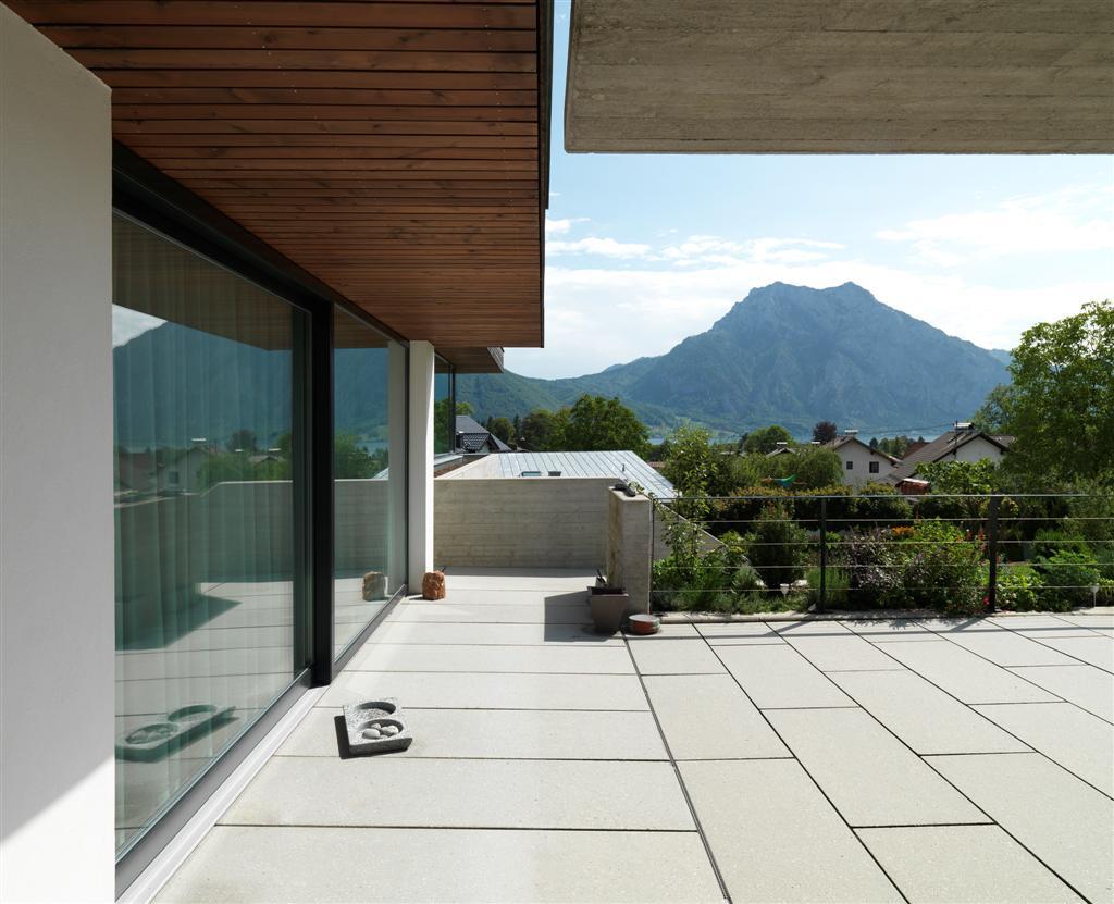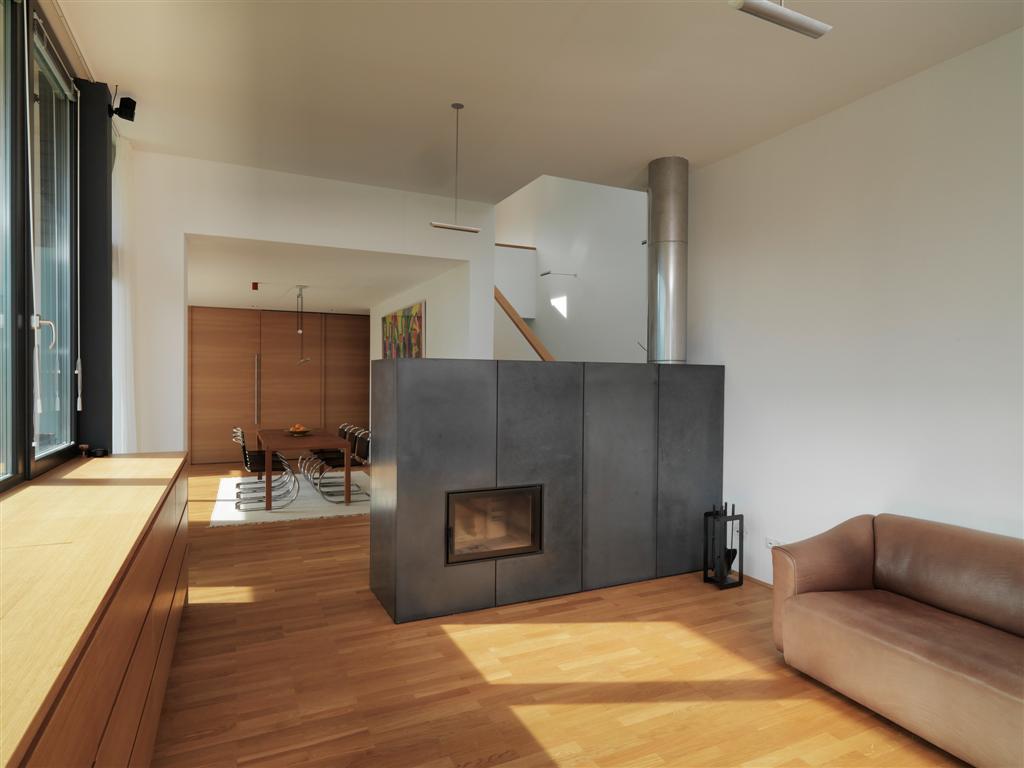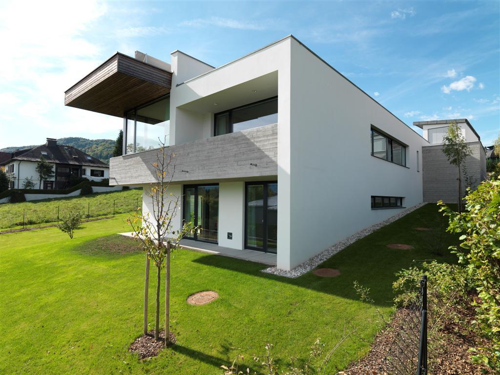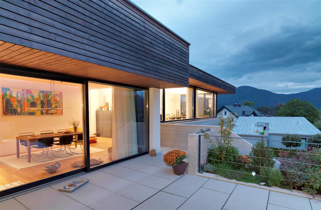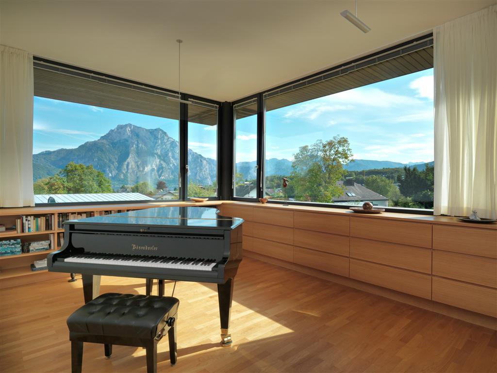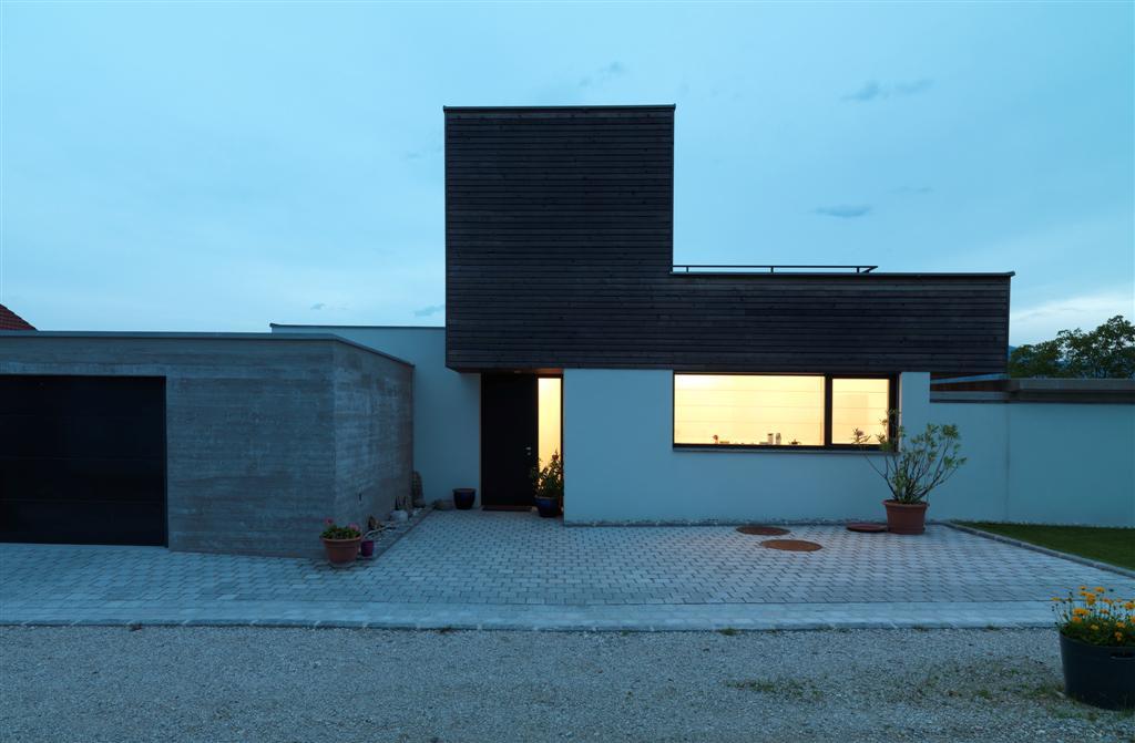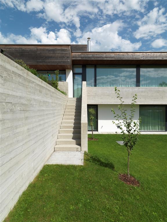 Im Inneren des Hauses wurden raumweise unterschiedlich Raumhöhen ausgeführt. Dadurch einsteht eine lebendige Dachlandschaft, die das Außenbild des Baukörpers maßgeblich prägt. Die weit auskragenden Vordächer der Dachkonstruktion ermöglichen einen wirksamen Schutz gegen Schnee und Regen. Sichtbeton und verputzte Ziegelwände bilden den konstruktiven Sockel, die Dachkonstruktion wurde in Holz gebaut.