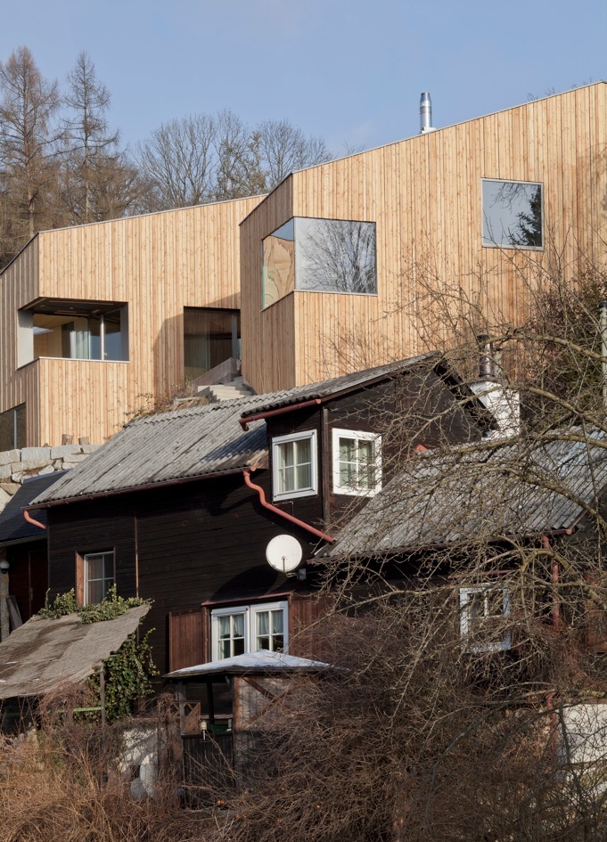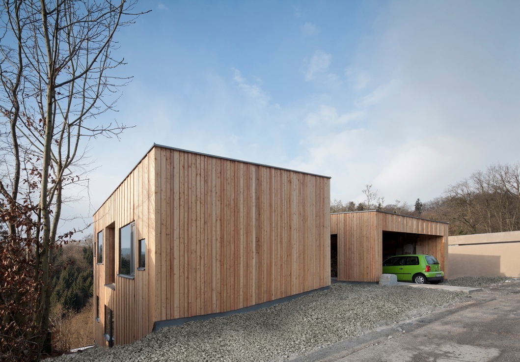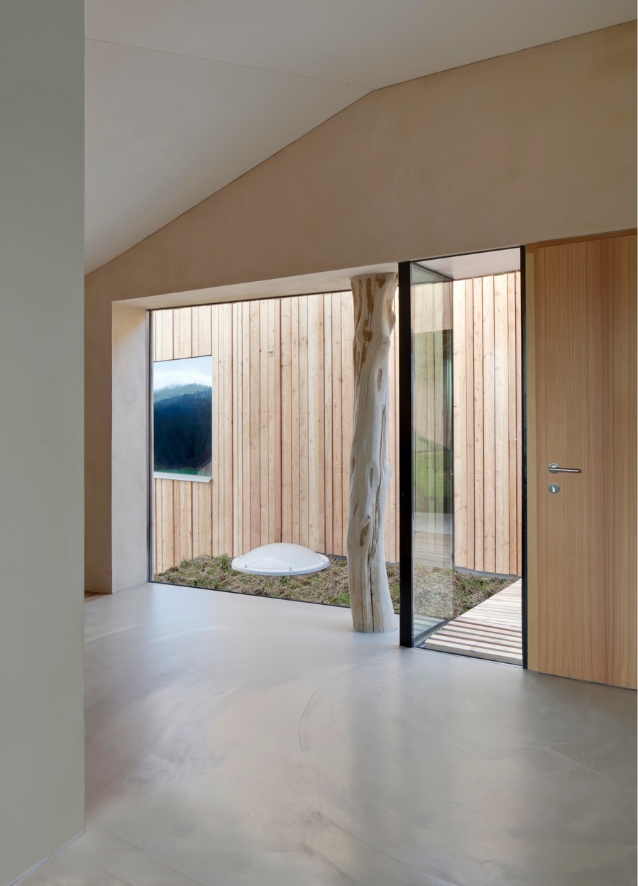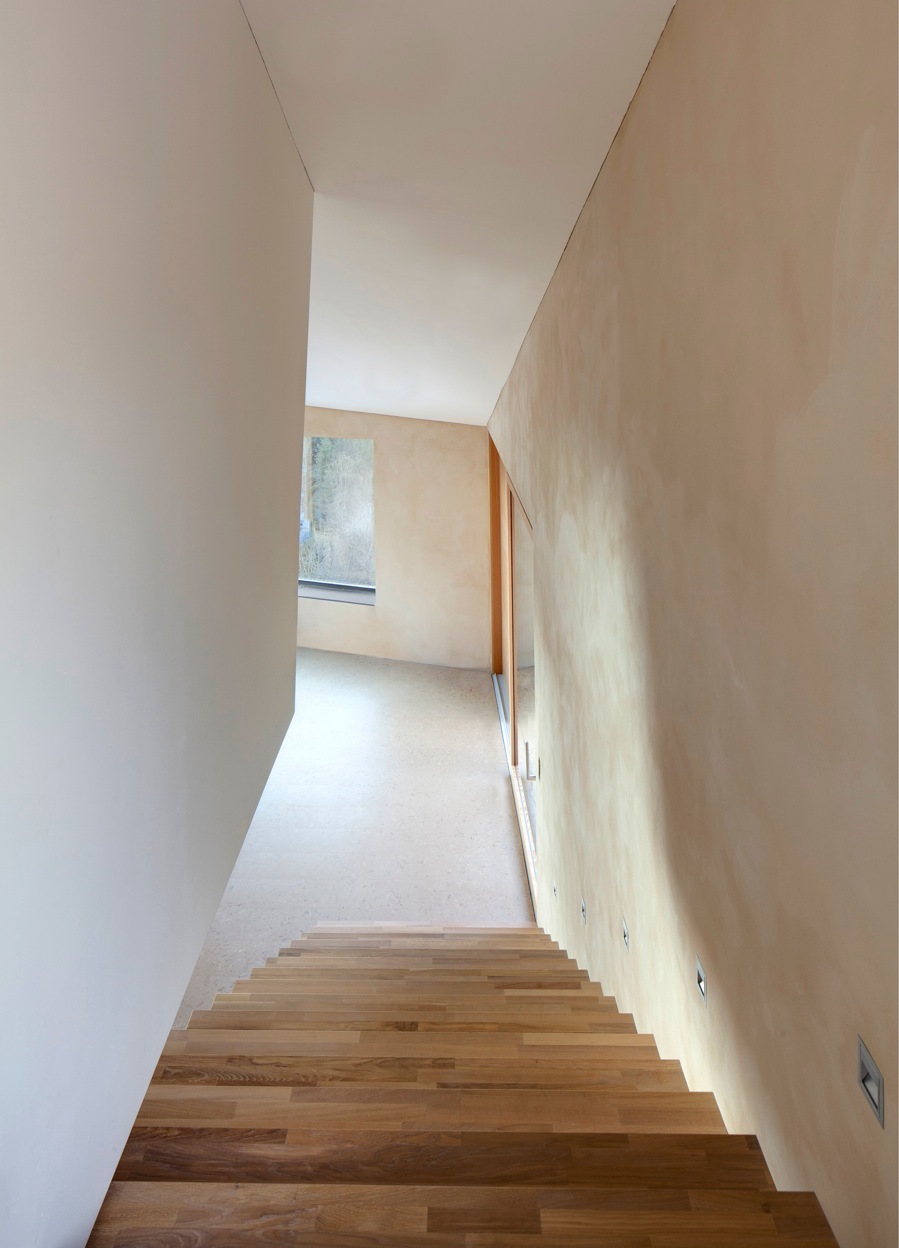 Die Raumzuteilungen führten zu einem Entwurf zweier Baukörper (Wohnhaus + Schlafhaus), die unterirdisch verbunden sind. Diese beiden Gebäude stellen sich nicht dem Hang entgegen; sie sind entlang der Falllinie situiert, um die Energie des Hanges durch ihre Mitte fließen zu lassen.