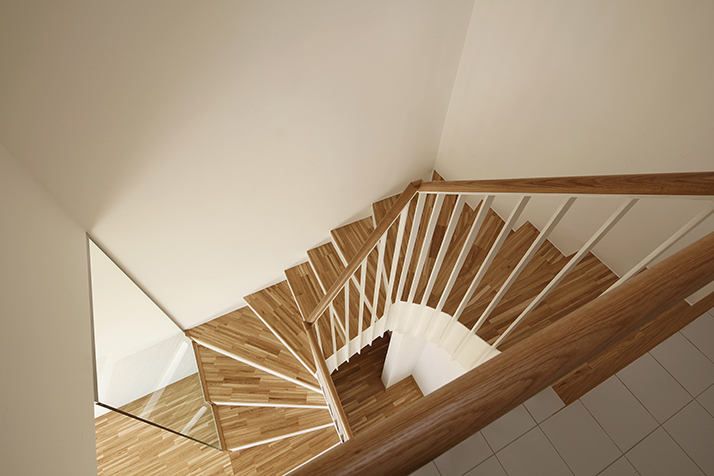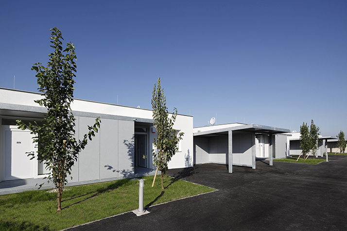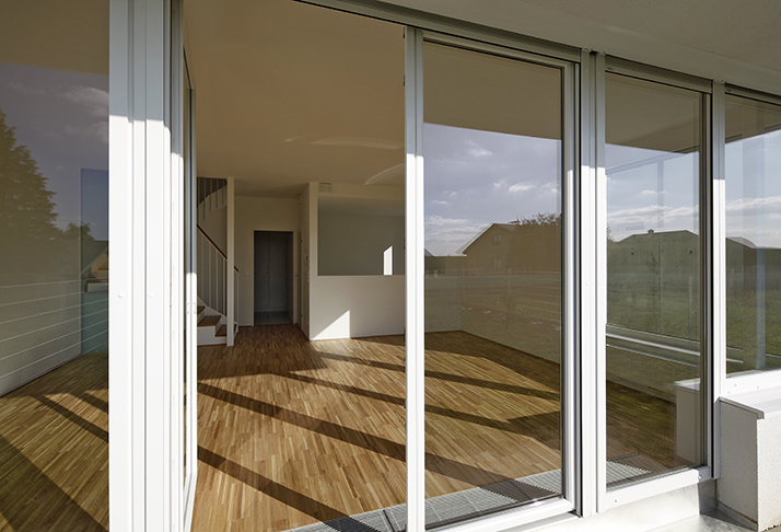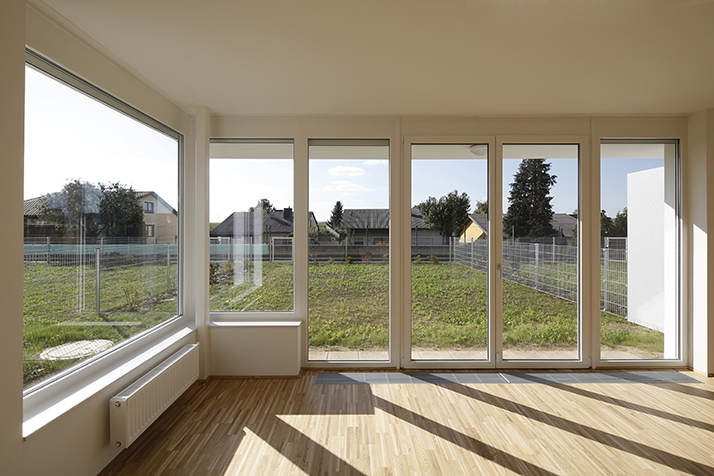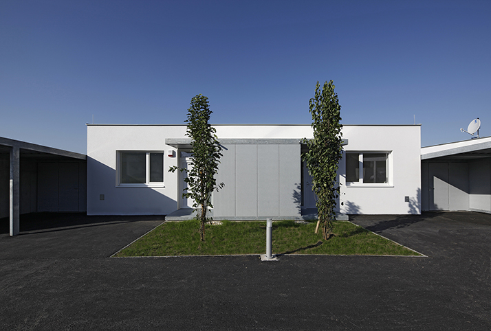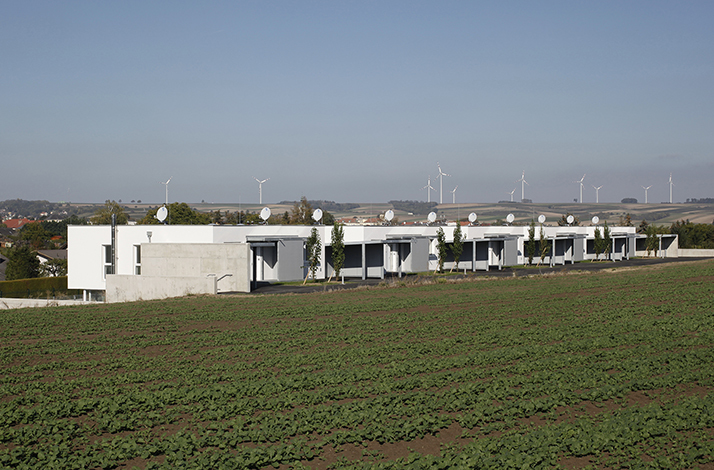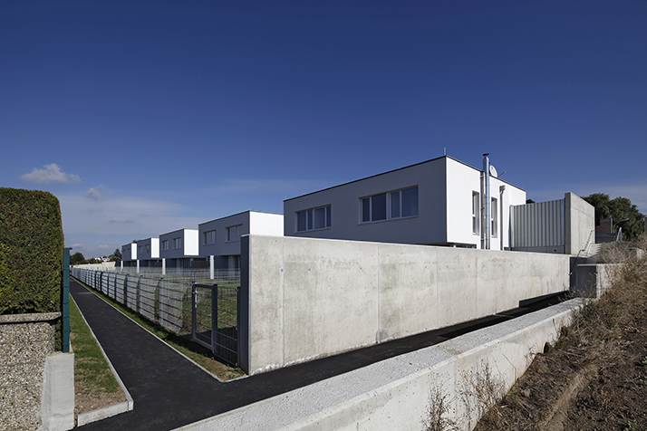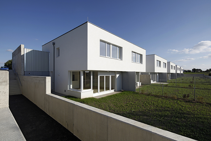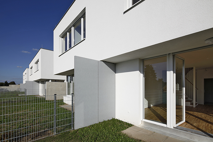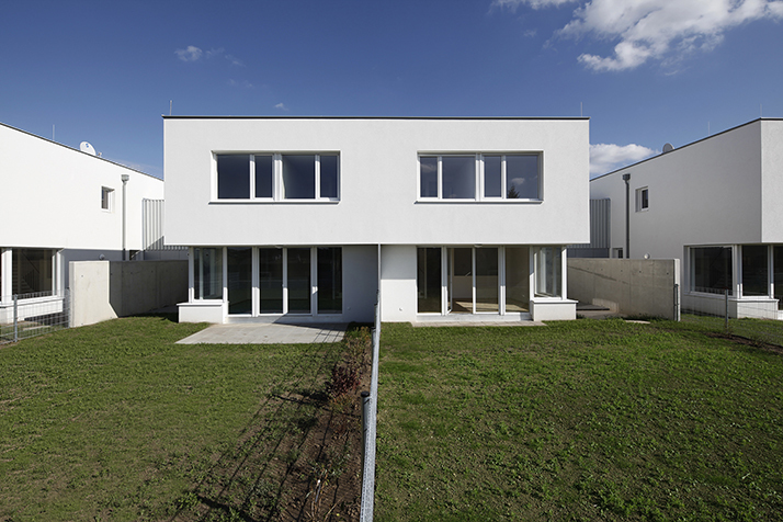 Die Reihenhäuser sind als 5 typengleiche Doppelhäuser konzipiert. Die Abstandsflächen dienen in der Erschließungsebene als gedeckte PKW-Abstellflächen und zur Auflockerung der Gesamtstruktur. Weiters wurde durch eine kompakte Gebäudeform darauf geachtet, die dahinterliegenden Bereiche geringstmöglich zu verschatten. Der Zugang erfolgt in der oberen Ebene, in welcher die Schlafräume untergebracht sind. Eine Stiege führt hinunter in die Gartenebene, in welcher sich neben Küche und Wohnzimmer auch noch Nebenräume befinden. Großflächige Verglasungen in der unteren Ebene öffnen den Wohnraum Richtung Garten. Zwischen den Baukörpern wurde ein geschützter und uneinsehbarer Außenraum entwickelt.