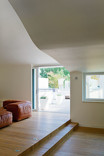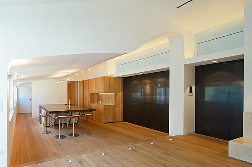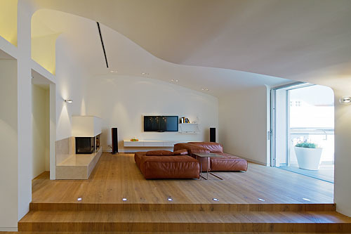 Die Wohnzonen wurden mit unterschiedlichem Charakter gestaltet: Eiche prägt die „öffentlichen“ Bereiche wohingegen im Schlafbereich Leder am Boden einen intimen Raum schafft. Die Bäder sind in Naturstein gehalten. Bei Bedarf trennen große Metallschiebetüren die privaten Rückzugsbereiche von öffentlichen Bereichen, wobei die Küche mit ihrem Koch-Essplatz als Insel mitten im Raum, gerahmt von Eichendielen-Hochschränken, das Zentrum bildet. Von der Küche führen Stufen zum erhöht liegenden Wohnzimmer und folgen dabei dem Niveausprung der Decke. Das Wohnzimmer liegt auf gleichem Niveau wie die großzügig dimensionierte Terrasse. Eine große Glasschiebetür öffnet den Wohnraum zur Terrasse und schafft ein Kontinuum dank eines kaum wahrzunehmenden Übergangs zwischen Innen und Außen. Für Schwellen und Staffeln ist hier glücklicherweise kein Platz.