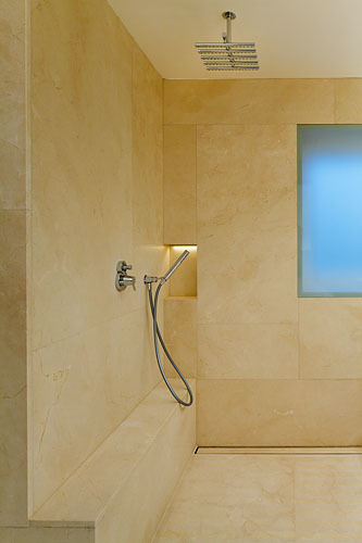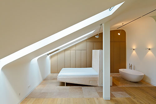 Im privaten Bereich rückt Textil an die Stelle von Holz und Leder: Die Schrankfronten im Schlafbereich sind mit Textil verkleidet und passen sich der geschwungenen Decke an. Faltschiebetüren im Wandschrank lassen aus einer vereinzelten Badewanne im Handumdrehen ein ganzes Bad entstehen. Bei sparsamer Möblierung nimmt die Lichtgebung im Raum eine wesentliche Rolle ein. Die künstliche Beleuchtung setzt gezielt Akzente, die das Understatement der natürlichen Materialien und erdigen Farbtöne unterstreichen. (Text: Architektinnen, redaktionell überarbeitet)