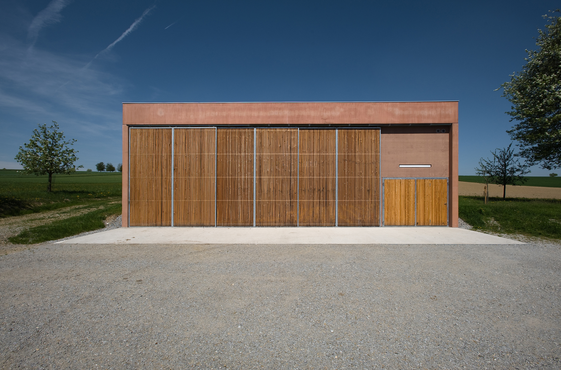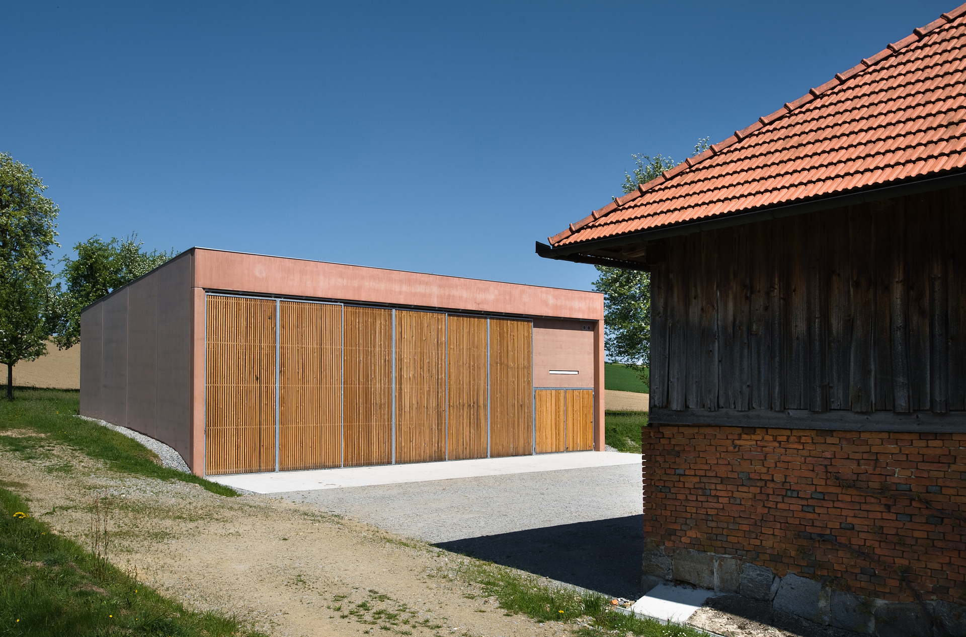 Durch die Längsausrichtung des Baukörpers parallel zum Altbestand spannt sich ein neuer Außenraum auf, welcher zum Mittelpunkt der landwirtschaftlichen Tätigkeit wird. Ein fünf Meter hoher Raum mit Pultdachkonstruktion und großzügigen Schiebetoren erlaubt dem Bauherrn optimale Arbeitsbedingungen und maximale Bewegungsfreiheit bei der Nutzung des Gebäudes.