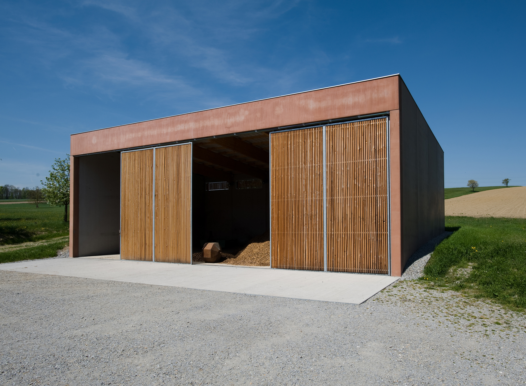 Das neue Bauwerk zeigt sich durch sein kraftvoll in Erscheinung tretendes Volumen selbstbewusst und eigenständig. Gleichzeitig knüpft es mit seinen in ziegelrot eingefärbten Sichtbetonwänden und den Holzschiebetoren an die Materialität des Altbestandes. Die Plastizität des Gebäudevolumens wird durch das Licht- und Schattenspiel der mit Holzleisten strukturierten Schiebetore verstärkt. Die Ausführung der Schiebetore als Lattenstruktur, sowie das Anordnen von Oberlichtern an der gegenüberliegenden Außenwand gewährleisten eine für das Hackgut erforderliche Durchlüftung des Lagerraums. Die verwendeten Materialien sind gefärbter Sichtbeton, verzinkter Stahl und sägeraues Lärchenholz. Materialien, die ein Altern und eine natürliche Patina zu lassen und sich so immer mehr dem Bestand annähern. (Text: Architekt:innen)