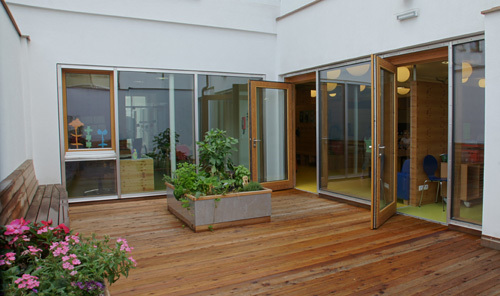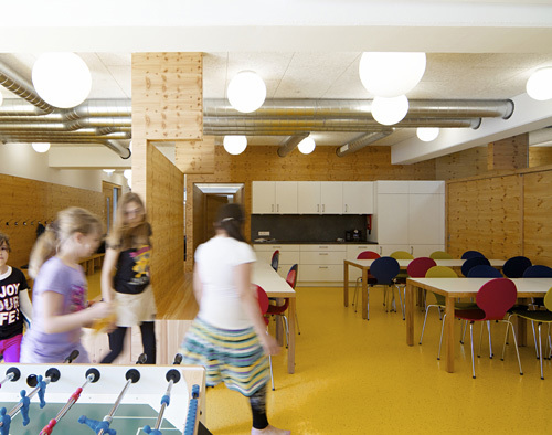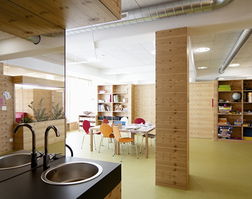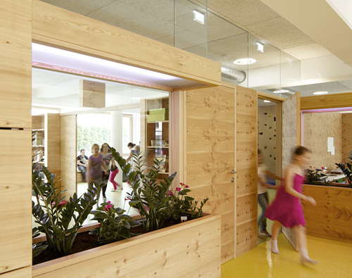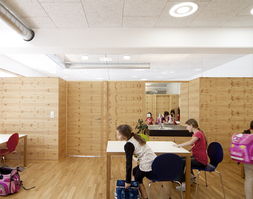 Im Inneren gliedert sich der Schülerhort in einen halböffentlichen Bereich mit Garderobe, Bewegungszone, Küche, Essbereich und den Sanitärräumen. An diese Zentralzone angrenzend sind die drei Gruppenräume an der Südseite und die zwei Lern- und Aufgabenräume an der Nordseite angeordnet. Die Räume können mit Schiebetüren in unterschiedlicher Weise zu größeren Einheiten verbunden werden. Verglaste Elemente im Zentralbereich sind als Pflanzeninseln gestaltet und ermöglichen interessante Einblicke in die Gruppenräume. Im gesamten Schülerhort lassen verglaste Oberlichte die Raumgrenzen verschwimmen und bringen das Tageslicht bis in die tiefen Raumzonen. (Text: Architekt; redakt. bearbeitet)