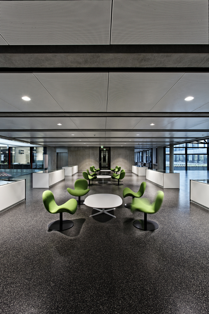 Das Gebäude ist flexibel konzipiert. Durch eine elementierte Trogplattendecke konnte, trotz 14,5 m Spannweite, auf eine Mittelstützenreihe verzichtet werden. Auf der unteren Ebene (Raumhöhe 4,9 m) befinden sich neben dem Hallenbetrieb (Vorserienbau) auch die Speziallabore. In den oberen Etagen (Raumhöhe 2,9 m) befinden sich Büroräume sowie die sogenannten Bürolabore. Die Büroräume werden über die Fassade natürlich belüftet. Die Fassade besteht hier aus zwei Bauteilen: Der transparente Teil (Kasten) ist für die Belichtung, der opake Teil (Trommel mit Klappe) ist für die Belüftung des Raums zuständig. Der Nutzer bedient die innenliegende Klappe zur manuellen Lüftung, die Gebäudesteuerung regelt die Stellung der Trommel zum Kasten und damit den thermischen Beitrag der Fassade für den Gesamtenergiebedarf (Unterscheidung Sommer- und Winterfall).