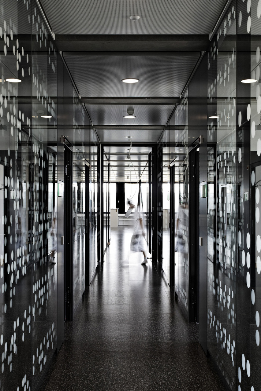 Der Künstler Klaus Schneider hat mit seinem Werk „erkenntnisfragen“ einen außergewöhnlichen Beitrag zur Gestaltung der Innenräume im Fronius Forschungs- und Entwicklungszentrum geleistet. Dazu wurden ausgewählte Texte in Blindenschrift aus semitransparentem Folienmaterial beidseitig auf die Innenflächen der doppelverglasten Systemtrennwände appliziert. Die Texte zitieren philosophische, literarische oder wissenschaftliche Erkenntnisse, die in Frageform transkribiert wurden. Ganz nebenbei erfüllt das Kunstwerk, das Erkenntnisfragen aufwirft, den Zweck, die Glasflächen sichtbar und damit sicher zu machen und gleichzeitig die gewünschte Transparenz zuzulassen. (Gekürzter Text der Architekten)