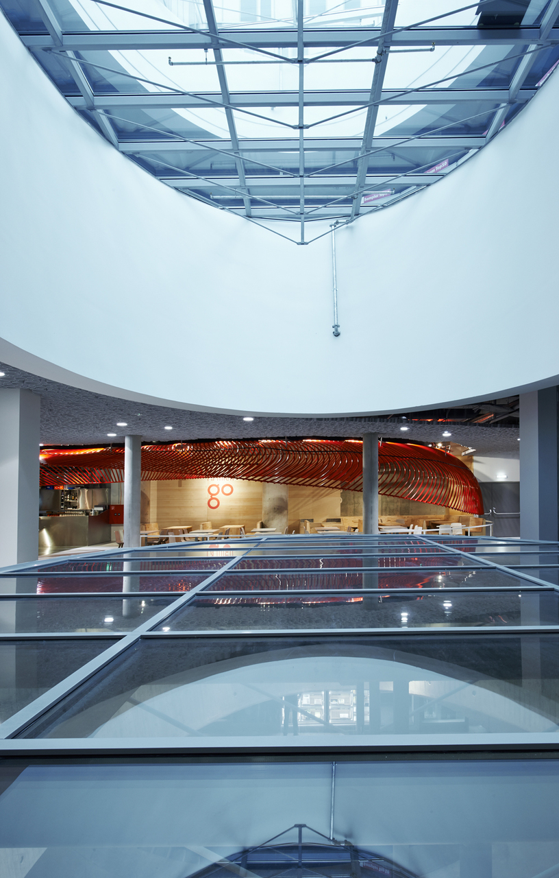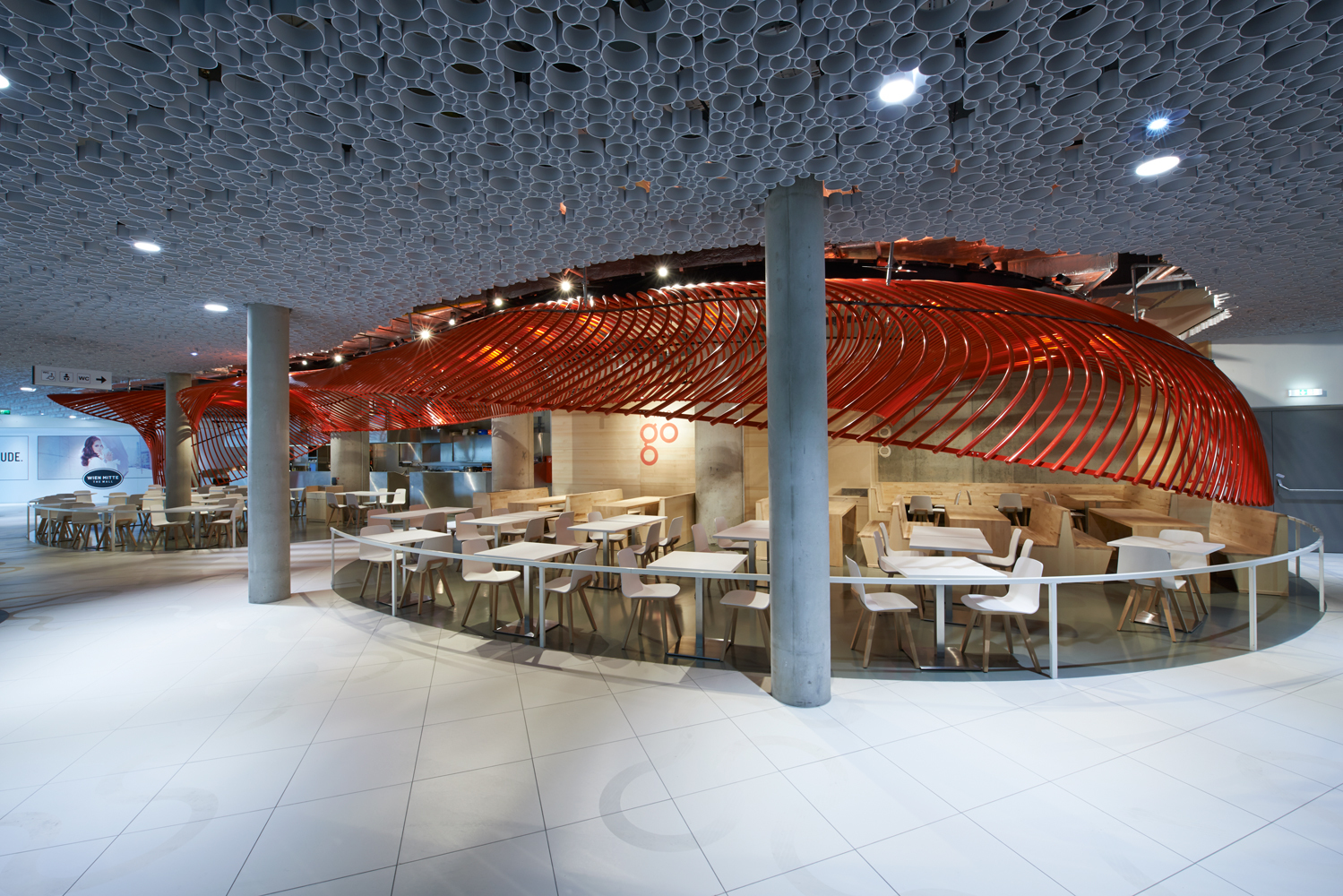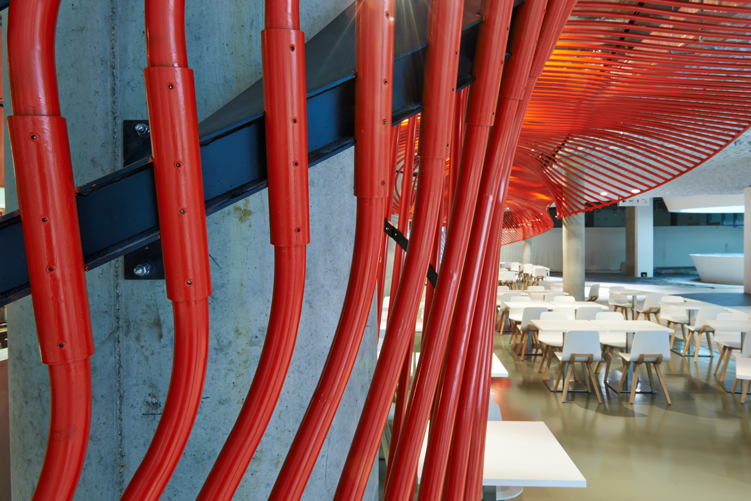 Für Passanten stellt die Deckenkonstruktion einen Blickfang dar und für die im Lokal verweilenden Gäste bietet sie einen Schirm gegenüber der Vielzahl an Reizen, die in einer Mall auf einen einwirken. Erst auf den zweiten Blick wird das Rückgrat der Konstruktion sichtbar. Ein 33 m langer, geschwungener Stahlträger trägt nicht nur 466 rote Rohre, von denen jedes einzelne über eine individuelle Krümmung verfügt, sondern dient zugleich als Halterung für Spots. Die Montage der Spots hinter den Rohren führt dazu, dass das ansonsten grelle Licht angenehm gestreut wird. Holzbänke, Tischoberflächen aus Corian und gebleichte Holzsessel laden – entgegen dem Motto des Lokals (ra’mien „go“) – zum Verweilen ein. Die Küche schließlich ist auf Funktionalität reduziert: ein Küchenblock aus Edelstahl und unverkleidete Lüftungsrohre – nichts, was man verstecken müsste. (Text: Martina Frühwirth)