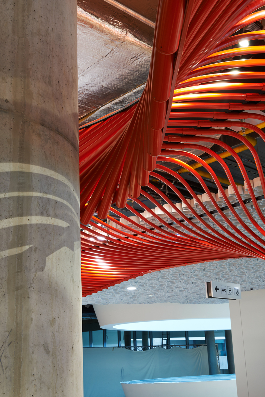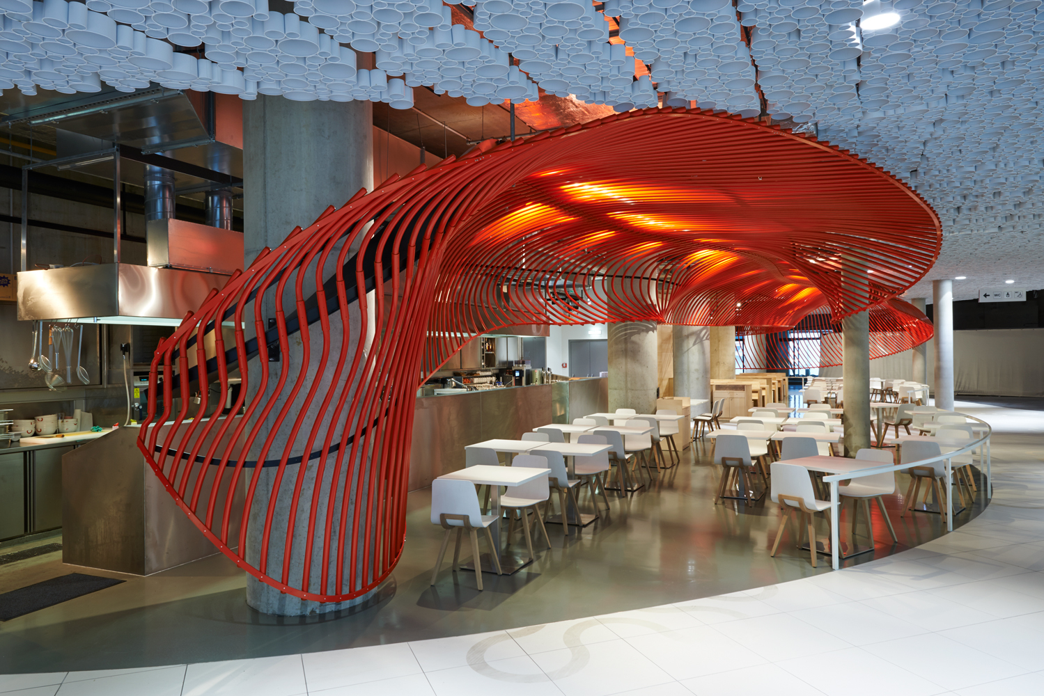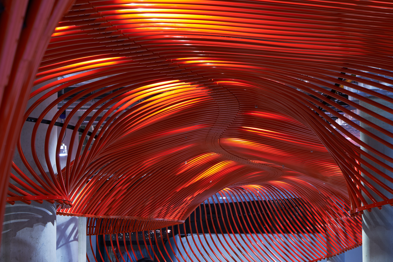 Für Passanten stellt die Deckenkonstruktion einen Blickfang dar und für die im Lokal verweilenden Gäste bietet sie einen Schirm gegenüber der Vielzahl an Reizen, die in einer Mall auf einen einwirken. Erst auf den zweiten Blick wird das Rückgrat der Konstruktion sichtbar. Ein 33 m langer, geschwungener Stahlträger trägt nicht nur 466 rote Rohre, von denen jedes einzelne über eine individuelle Krümmung verfügt, sondern dient zugleich als Halterung für Spots. Die Montage der Spots hinter den Rohren führt dazu, dass das ansonsten grelle Licht angenehm gestreut wird. Holzbänke, Tischoberflächen aus Corian und gebleichte Holzsessel laden – entgegen dem Motto des Lokals (ra’mien „go“) – zum Verweilen ein. Die Küche schließlich ist auf Funktionalität reduziert: ein Küchenblock aus Edelstahl und unverkleidete Lüftungsrohre – nichts, was man verstecken müsste. (Text: Martina Frühwirth)