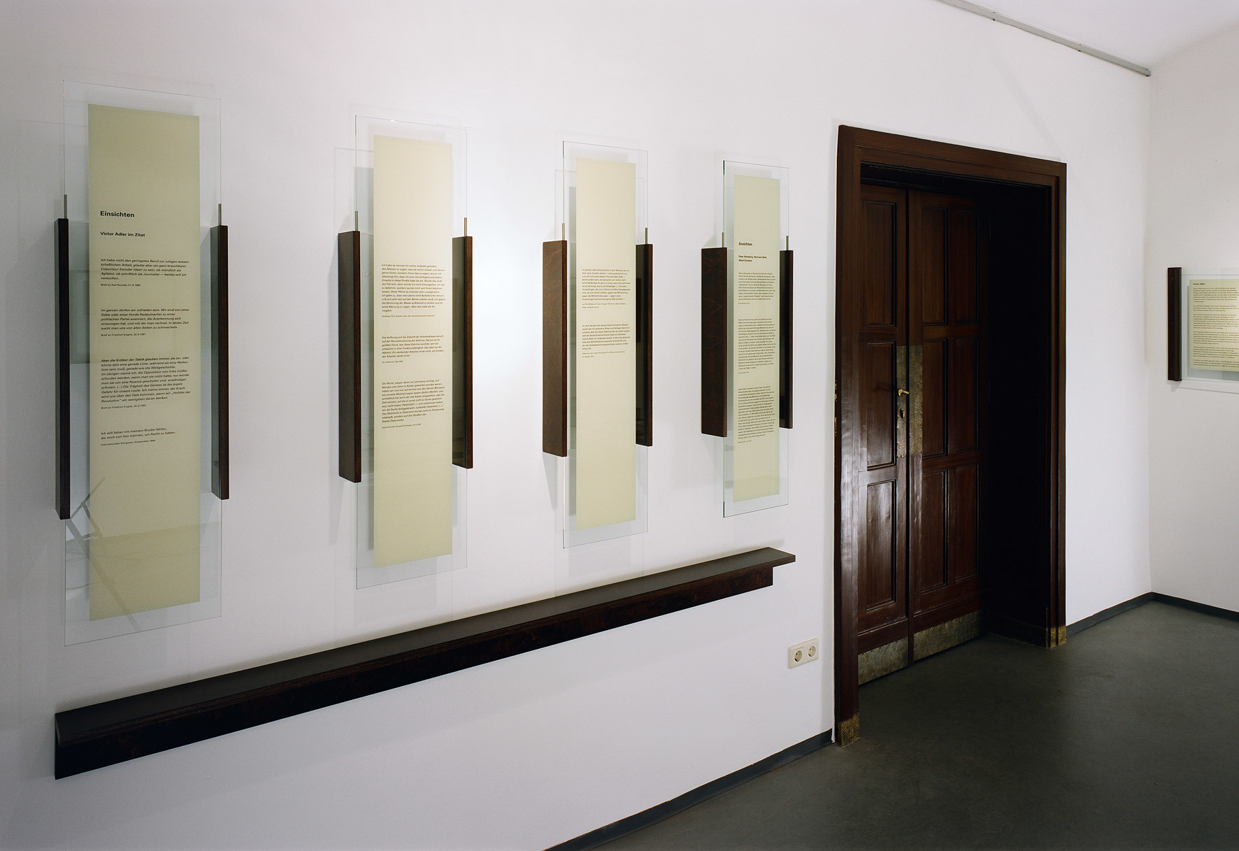 Dreidimensionale Rahmen an den Wänden dienen als Träger für unterschiedliche Inhalte: einmal befindet sich im Rahmen ein Text, einmal ein Objekt, einmal eine leere Wandfläche, die mit einem Bild überblendet wird. Die Inhalte sind in den Rahmen in unterschiedlicher Distanz zum Betrachter montiert: einmal ganz vorne, möglichst nahe beim Betrachter, bei einem anderen Rahmen treten sie in den Hintergrund. Über die wechselnden Objektebenen entsteht eine Hierarchie der Objekte zueinander. Mit den seriellen Versetzungen entwickelt sich die Ausstellung im Raum über die Wände hinweg, wobei in Summe ein homogener Eindruck entsteht. In der Mitte des Raums befindet sich ein Tisch, auf dem ebenfalls Objekte und Texte ausgestellt werden. Das Material Glas kommt hier gleich in mehreren Funktionen zum Einsatz: als Textträger – indem der Text auf der Platte zum Betrachter geneigt wird, als Vitrine – indem das Objekt vom Glassturz überdeckt wird und schließlich als Abdeckung – indem das Glas Textseiten auf der Tischplatte fixiert. Ein eigens entwickeltes Fräs-System verhindert, dass die Glasplatten auf der Tischplatte verrutschen. Für eine Peter Altenberg-Ausstellung hat der Architekt bereits einmal mit modularen Elementen experimentiert. Im Victor Adler Gedenkraum erreichte der Einsatz der modulartigen Elemente schließlich Perfektion.