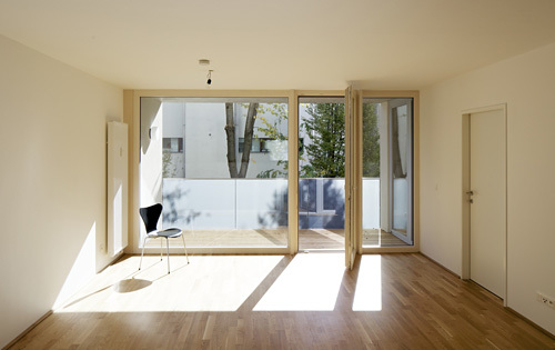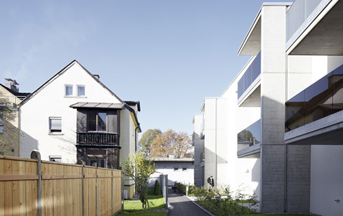 Wo sich bis vor kurzem unzeitgemäße, zum Teil ohne Bäder ausgestattete Kleinstwohnungen aus den Kriegsjahren befanden, realisieren Fügenschuh Hrdlovics Architekten für die IIG – Innsbrucker Immobilien GmbH eine neue Wohnanlage. Zwei neue Baukörper fassen in zeilenförmiger Bebauung den Straßenraum, der mittels Baumgruppen und Vorgärten den Charakter einer Wohnstraße erhält. Jeder der, konsequent nach Süden orientierten, 2- bis 4-Zimmerwohnungen ist mit einem geschützten Balkon, einer Loggia oder einem Garten ein privater Außenraum zugeordnet, als Kommunikationszonen gestaltete Stiegenhäuser gewährleisten die Durchlässigkeit zum öffentlichen Straßenraum und den dahinter liegenden Grünflächen. (Text: Claudia Wedekind)